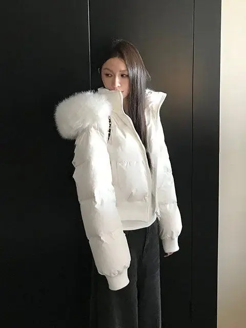 Fashion Street Simple Fur Collar White Zipper Hooded Short Jacket Women 2025 Winter Plus Velvet Thickened Warm Casual Jacket