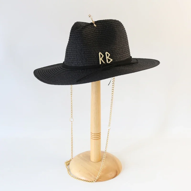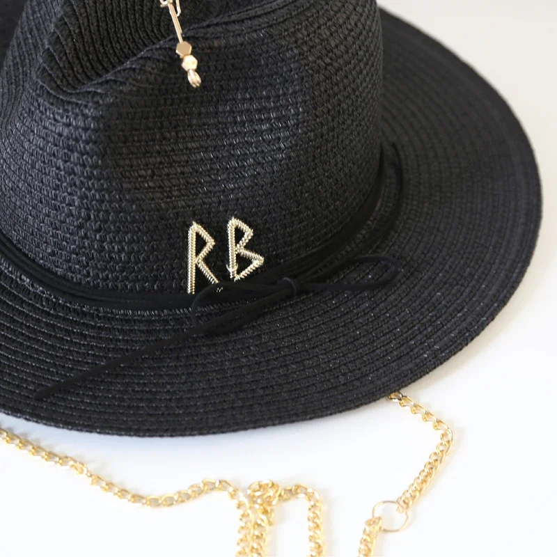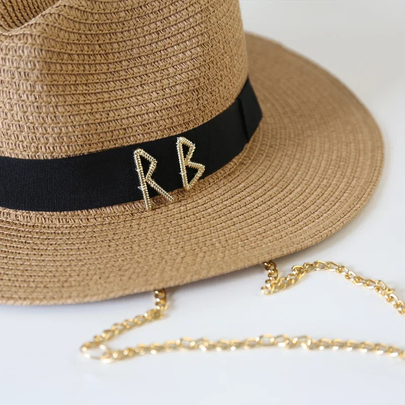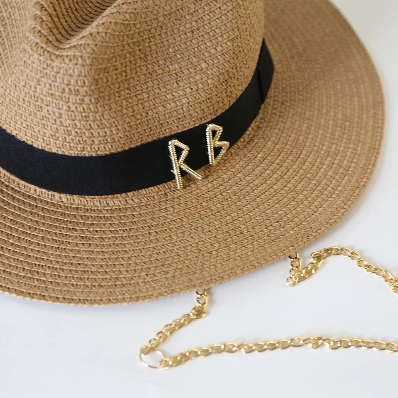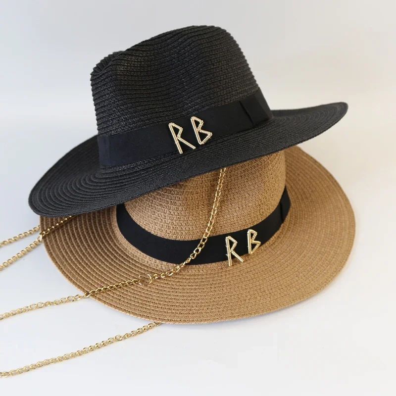 Fashionable Metal RB Letter Straw Hats for Women Men Summer Outdoor Holidays Beach Sun Hat Straw Hats for Women Fashion Panama