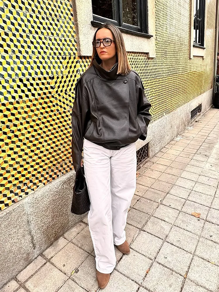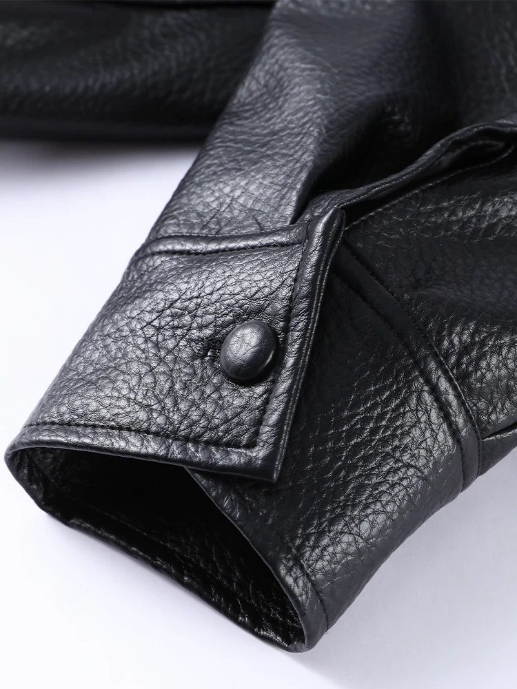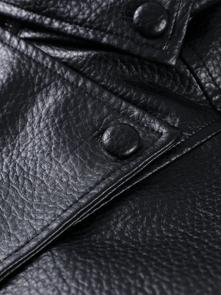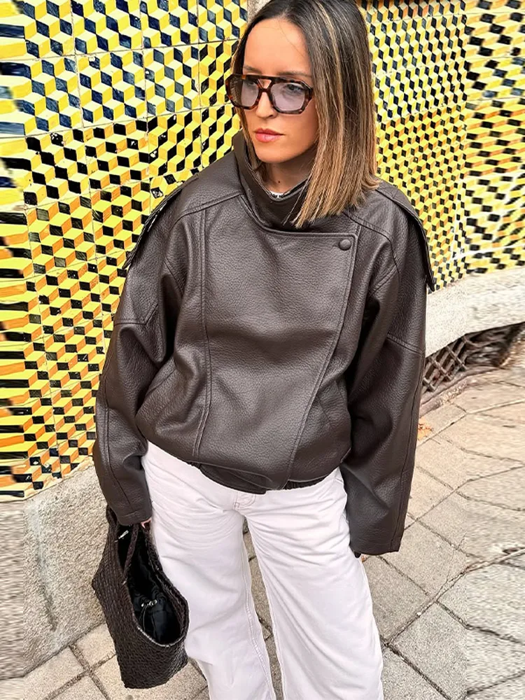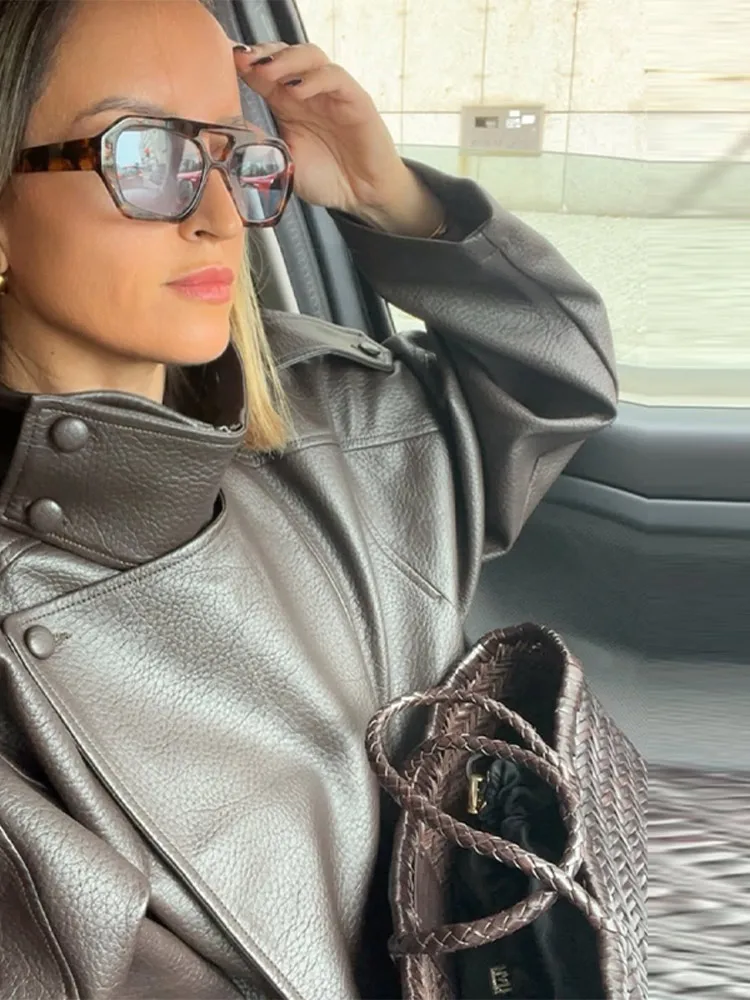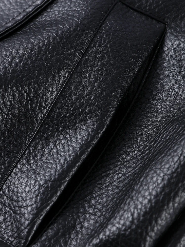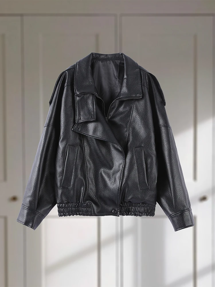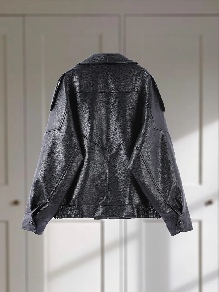 Featuring a skin-friendly smooth inner lining (non-sticky) and a structured, non-collapsing outer leather. It withstands cool breezes while maintaining a stylish silhouette, offering both comfort and aesthetic appeal.