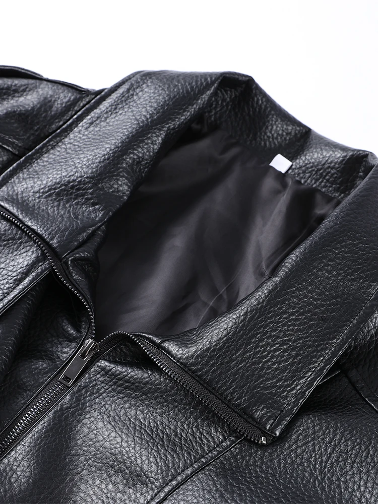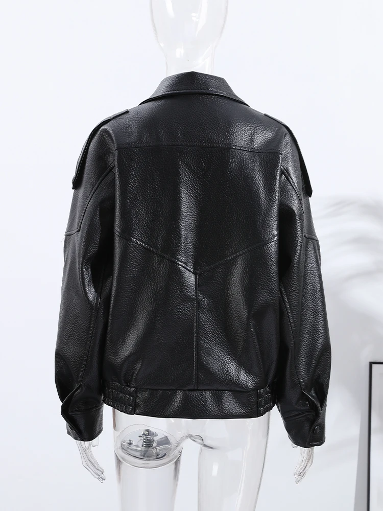 Faux Leather Stand Collar Bomber Jacket Women Locomotive Epaulet Slant Opening Ruched Coats Fashion Autumn Winter Lady Outerwear