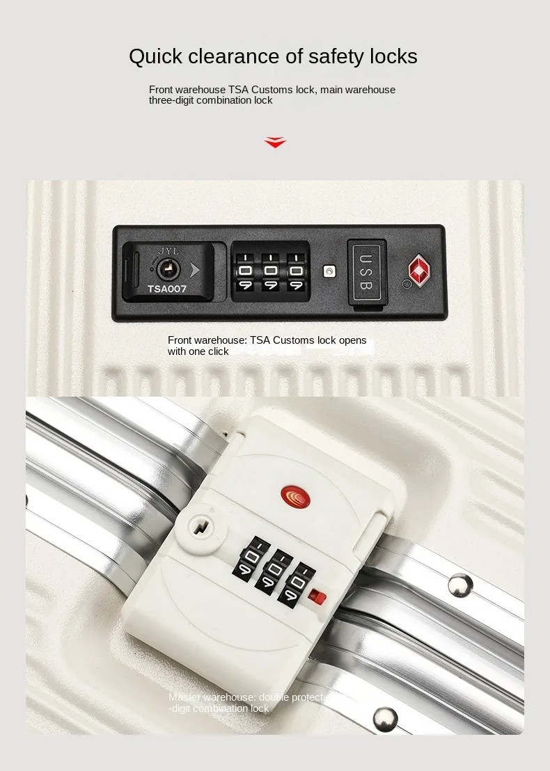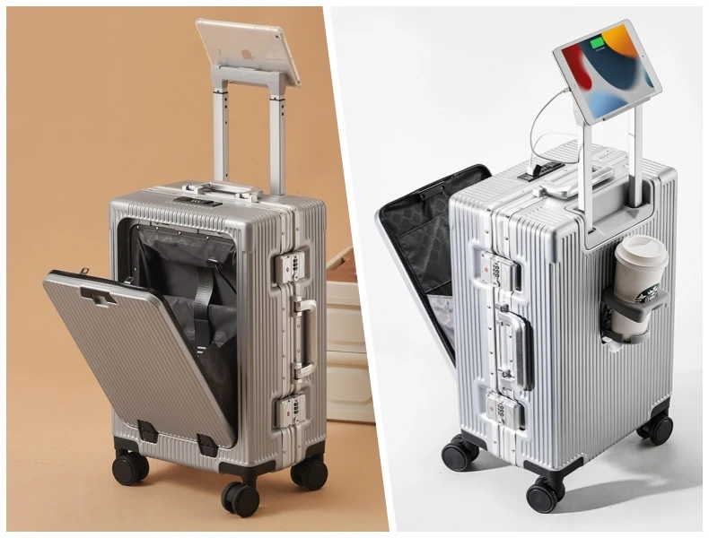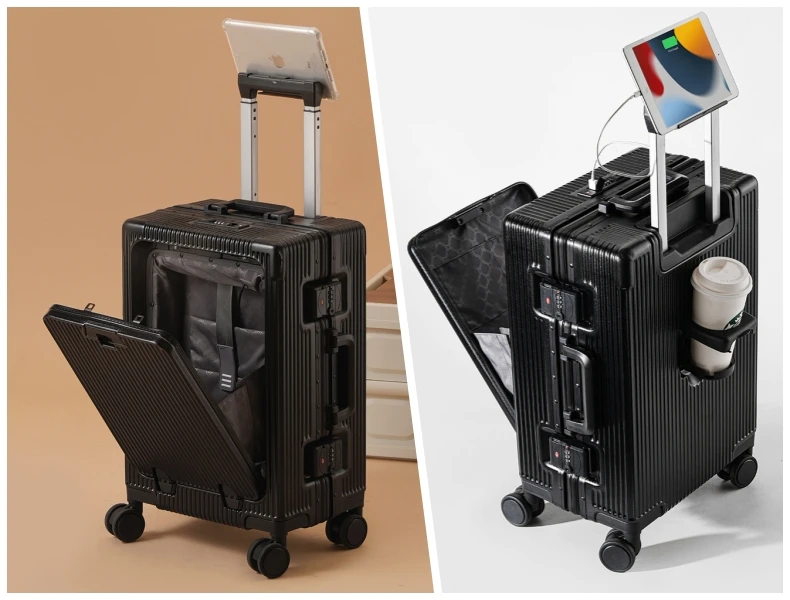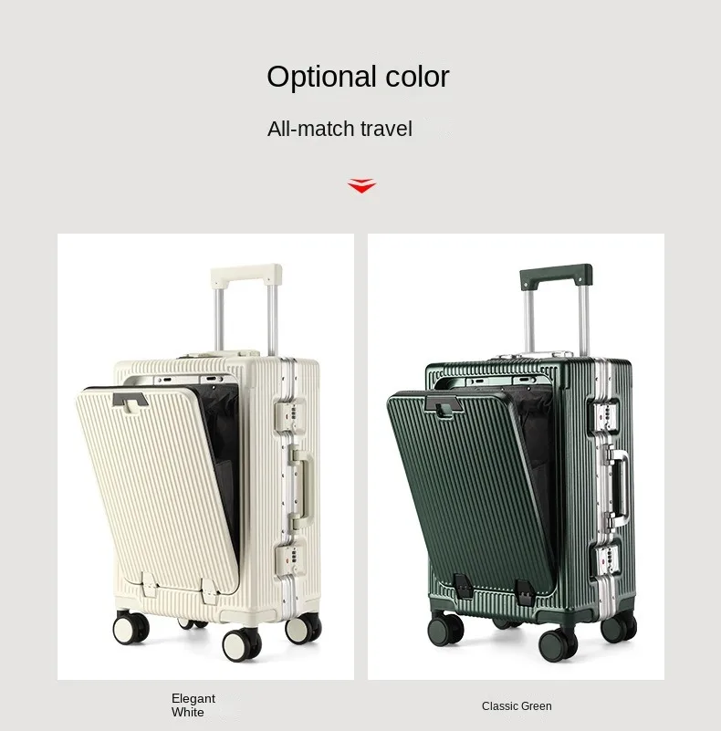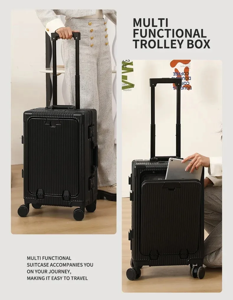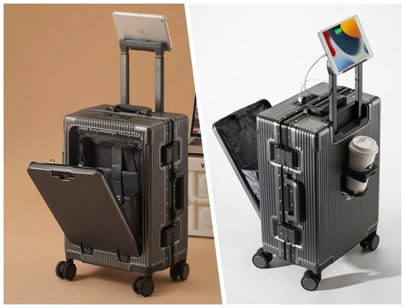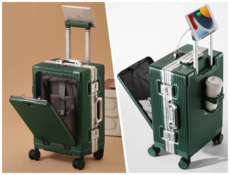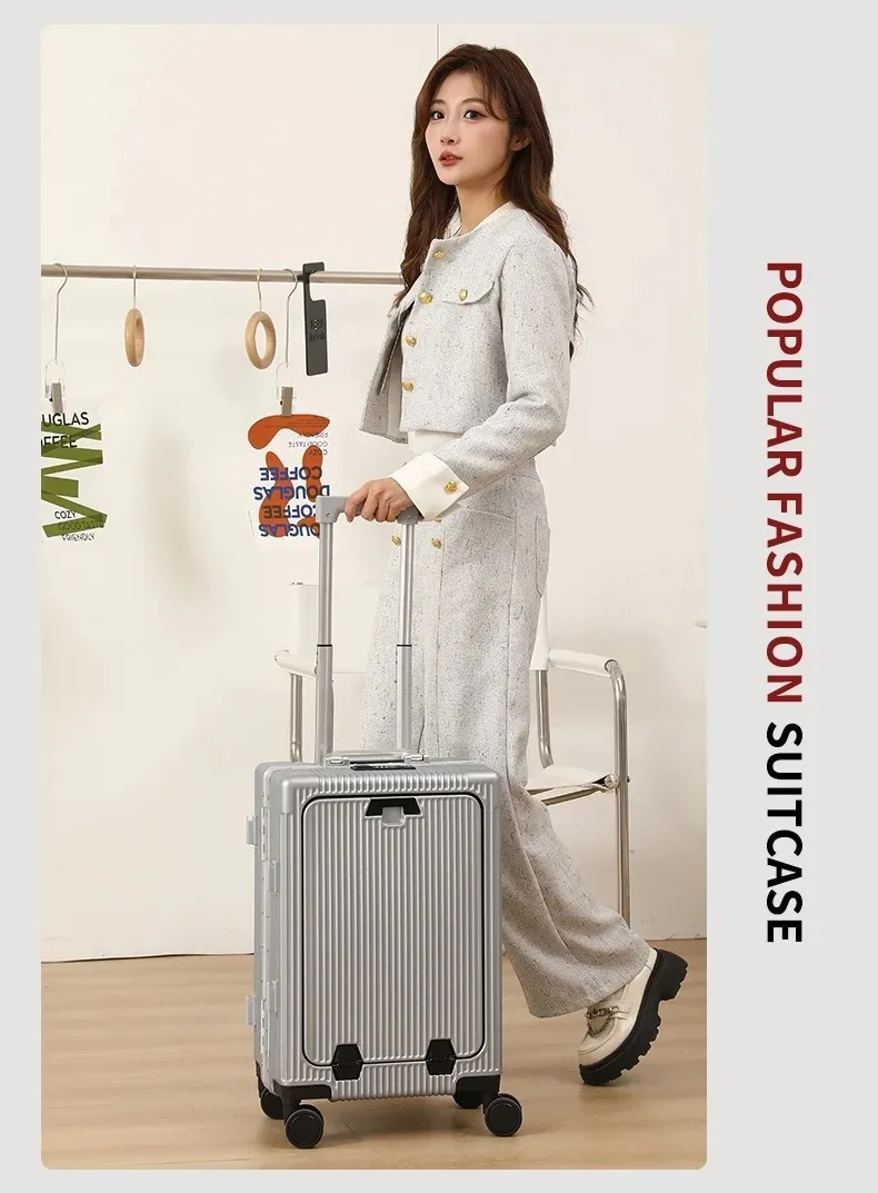 Front Opening Pocket Suitcase with Aluminum Alloy Frame Lock USB Charging Plug Spinner Wheel Trolley Bags Travel Rolling Luggage