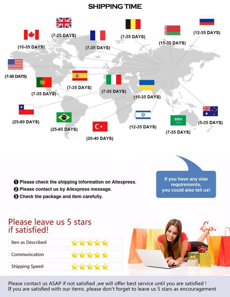 6.The expected delivery date will be affected by customs, weather etc., sometimes it may take a little longer to receive,Please contact us when you have not received the package to extend your order protection time.