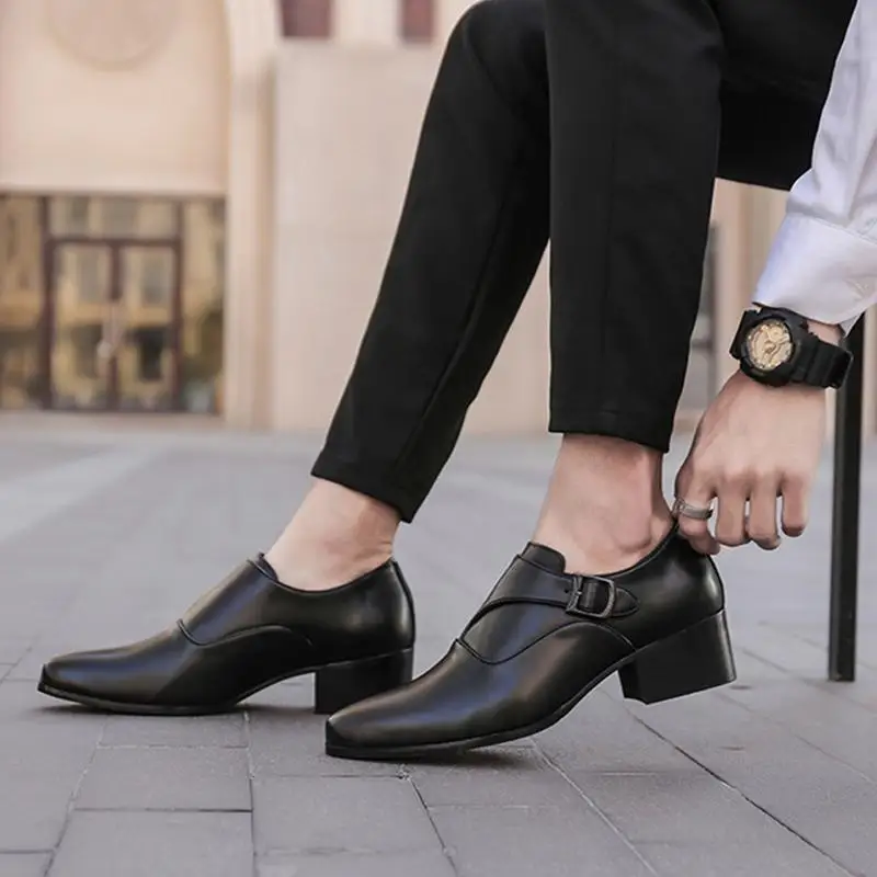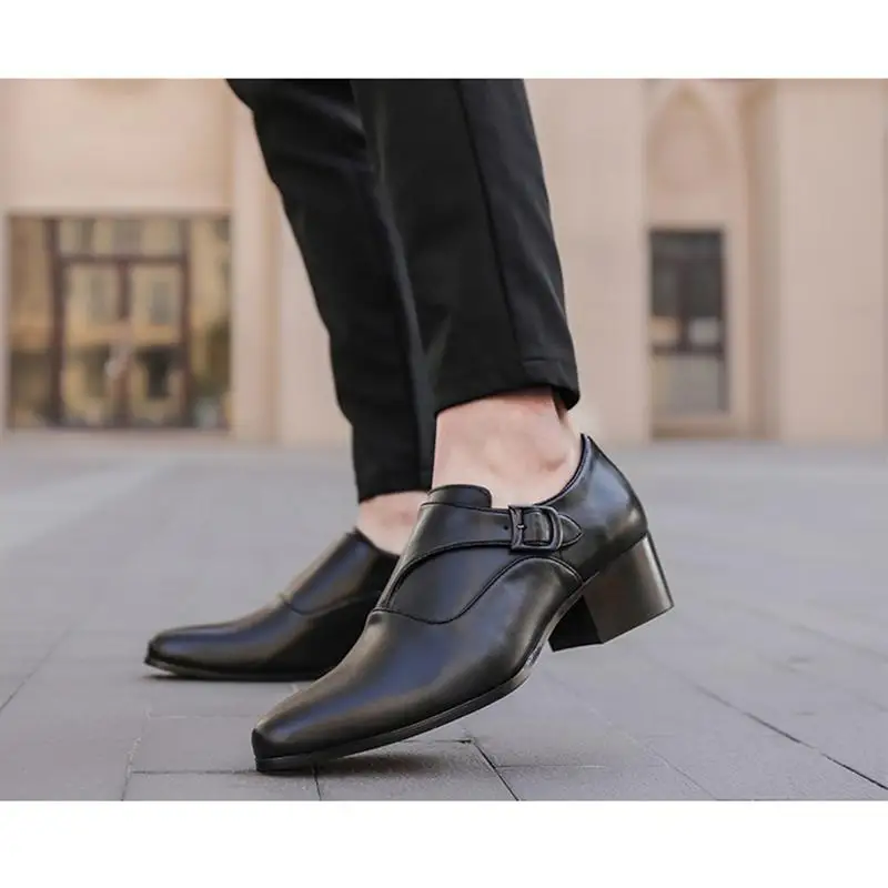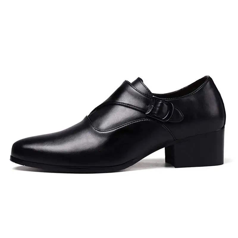 Genuine Leather Men Height Increasing Dress Shoes 6cm Fashion Business Brand Male Footwear Pure Black Monks