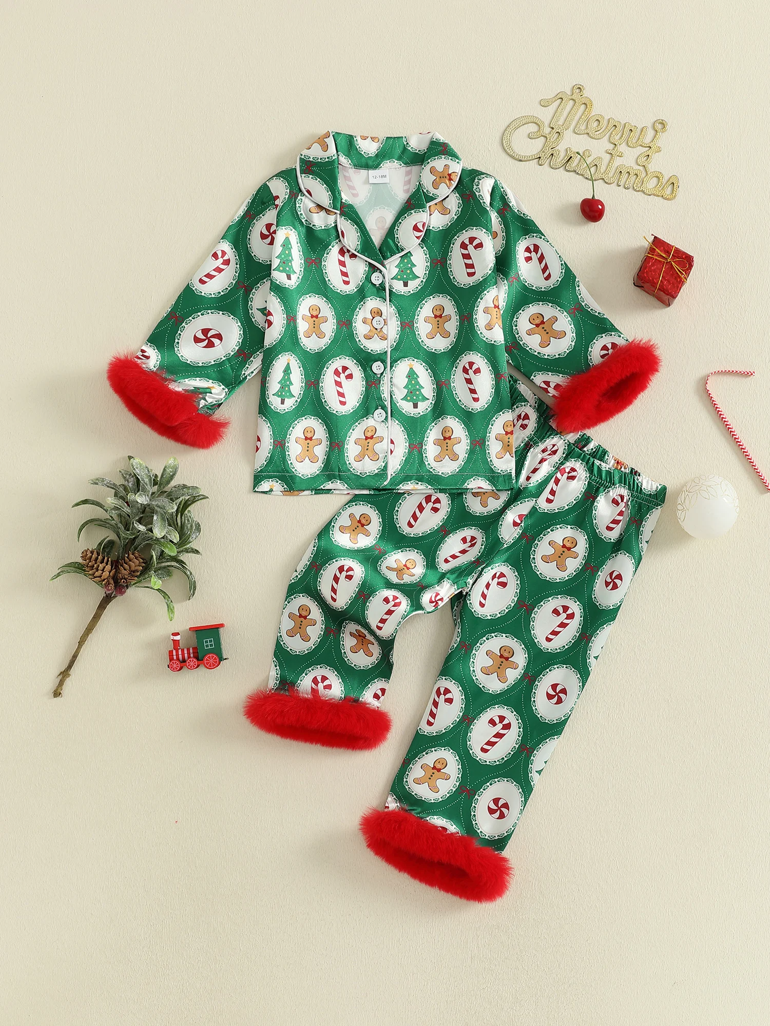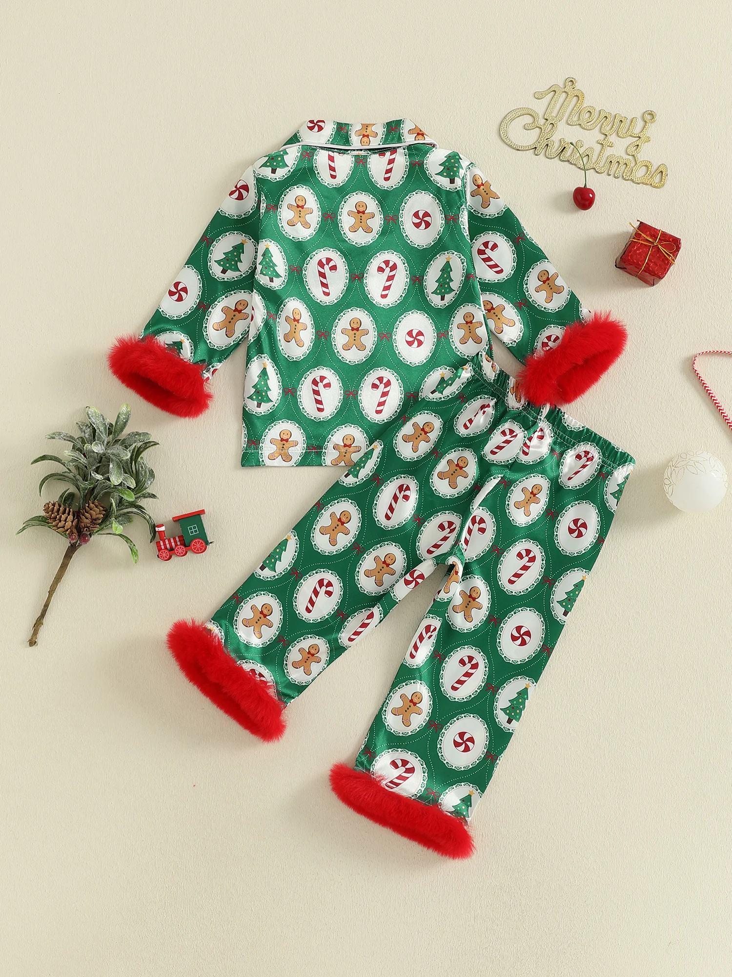 Toddler Girl Christmas Satin Pajamas Set Gingerbread Man Print Lapel Long Sleeve Button Down Tops with Pants SleepwearSize(cm)
