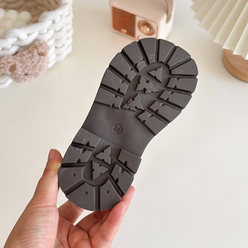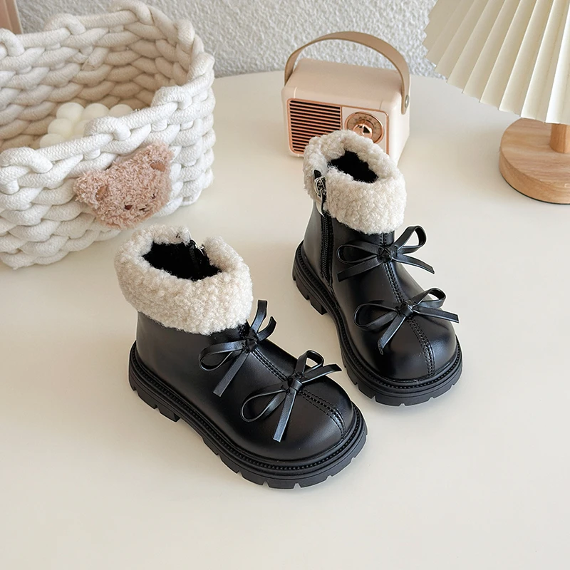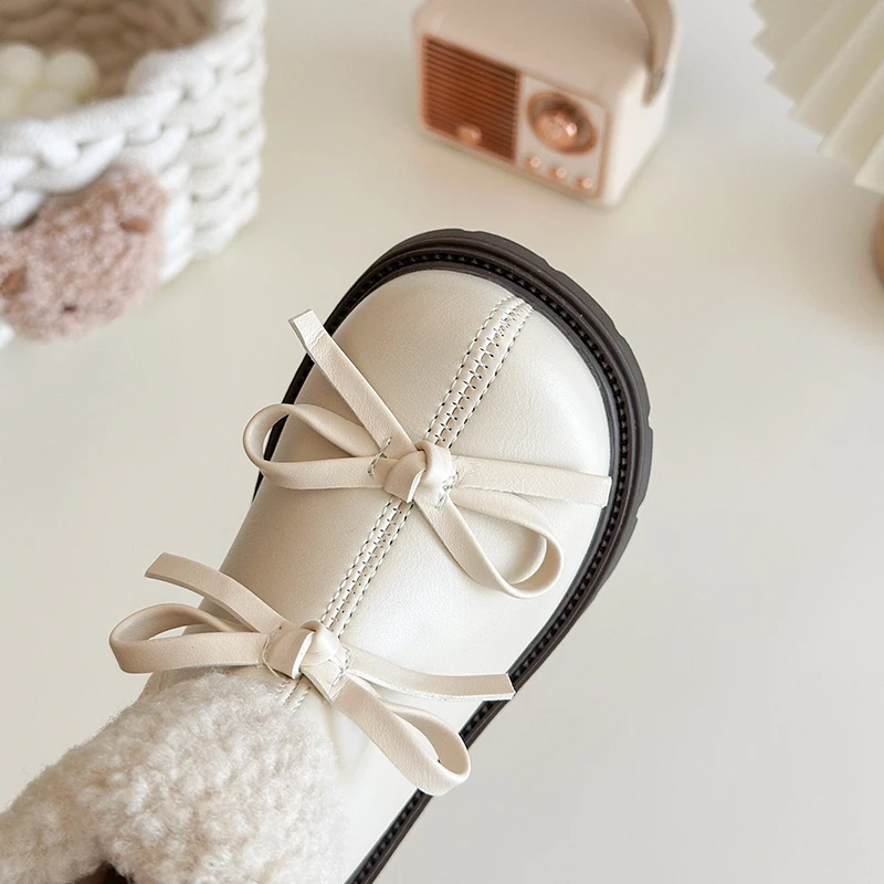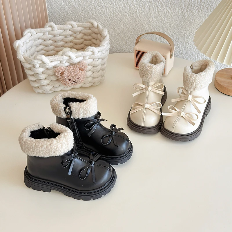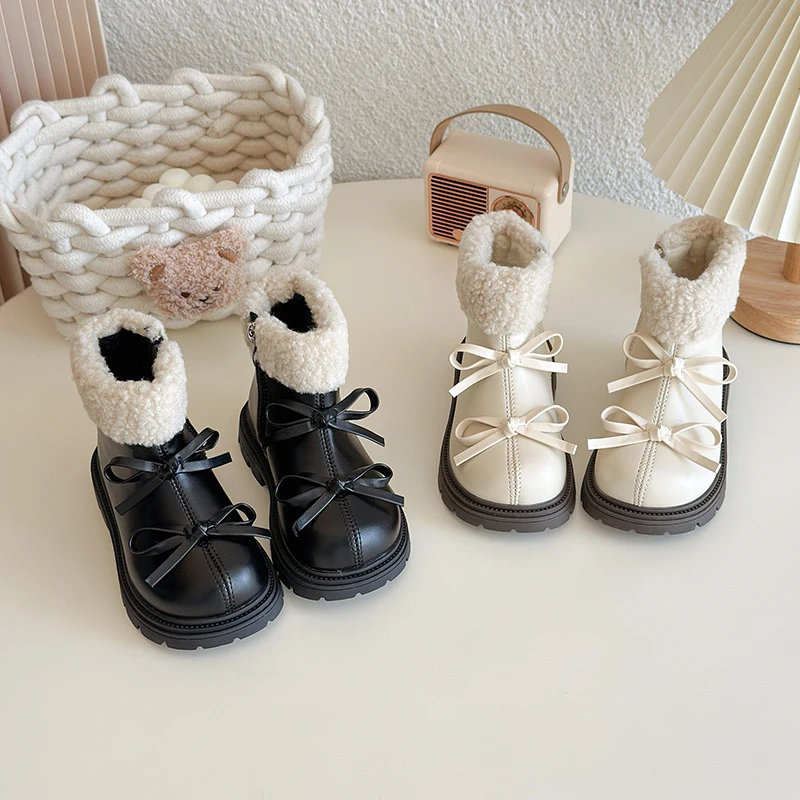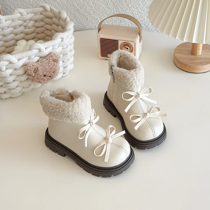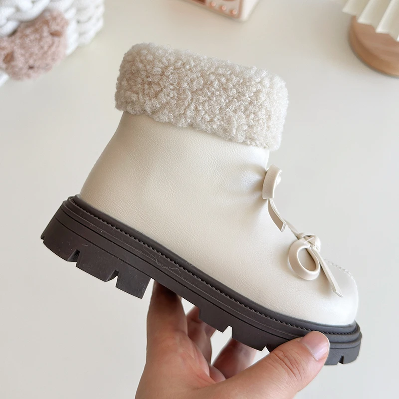 Girls Padded Fashion Leather Boots 2-18 Years Old Thickened Bow Hairy Girls Cotton Shoes Winter Beige Soft Non-slip Kids Boots