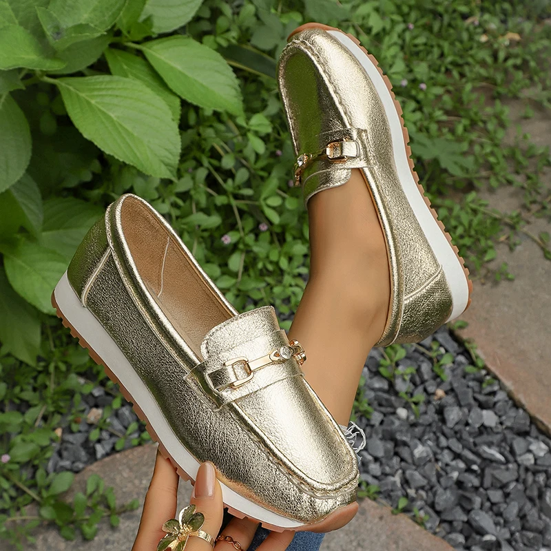 Gold Silver Metal Chain Flats Shoes Women Spring Autumn Plus Size Platform Loafers Woman Slip On Soft Bottom Casual Shoes Female
