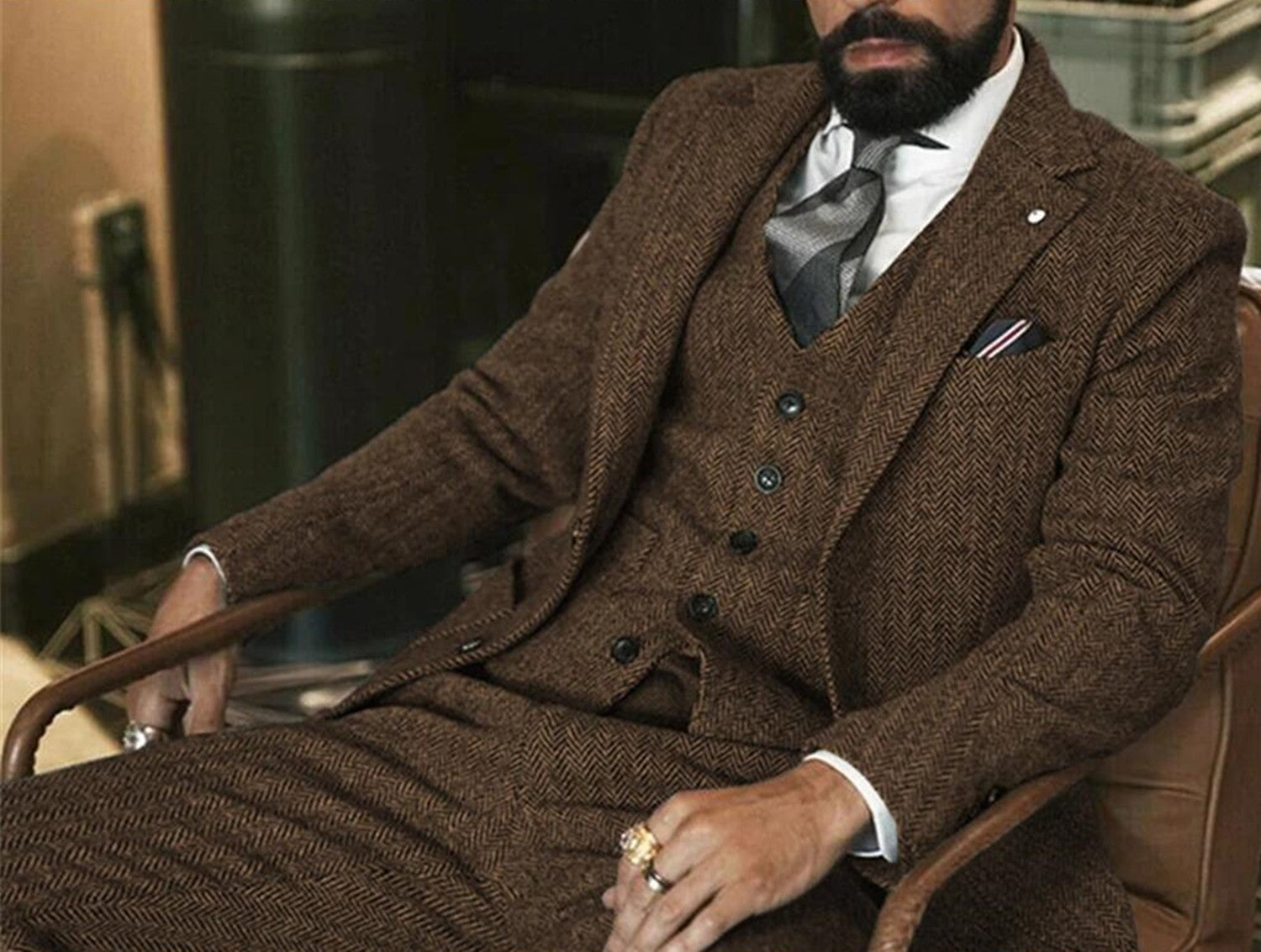 Gray Wool Tweed Winter Suit for Men Herringbone Slim Fit Formal Groom Tuxedo 3 Piece Wedding Male Suits (Jacket+Vest+Pants)