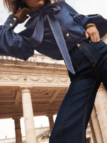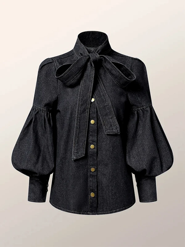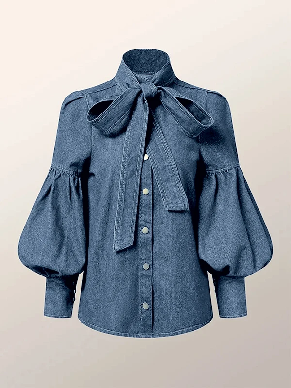 Gymystars New Trendy Imitation Denim Blouse Tops for Women Long Puff Sleeves Bow-Embellished High Neck Women's Autumn Shirts