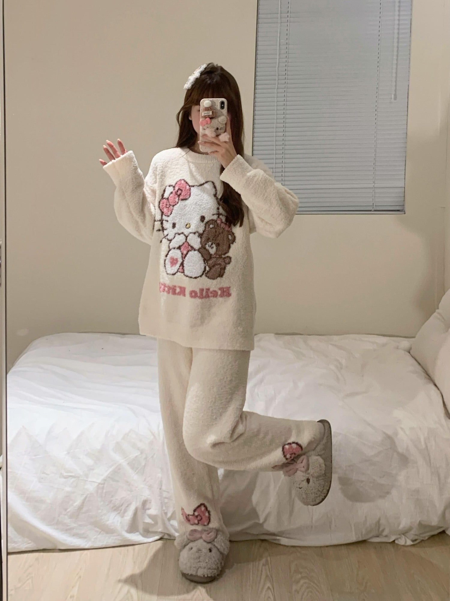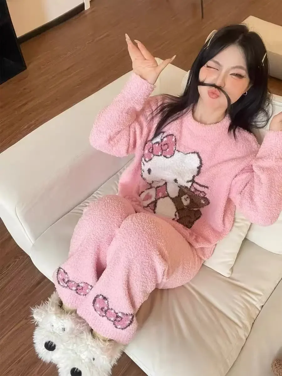 Hello Kitty Women's 2025 Kawaii Brushed Fleece Pajama Set Fall Winter Plush Thermal Cozy Sleepwear & Home Loungewear