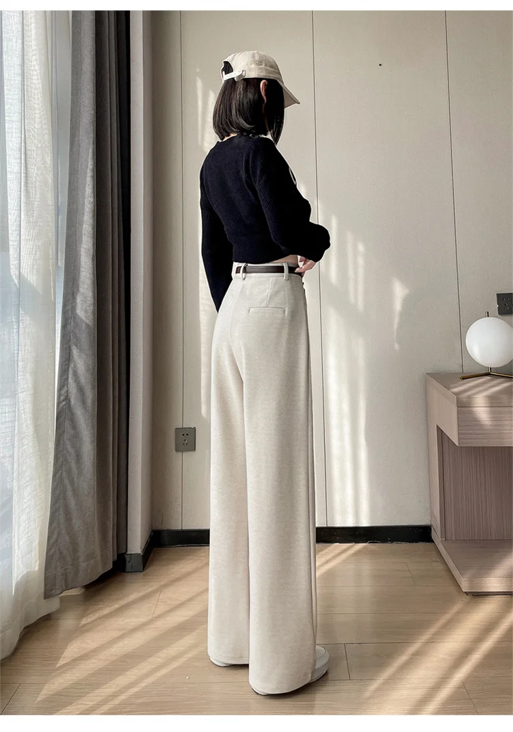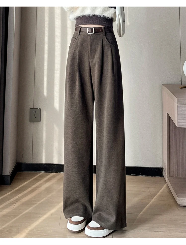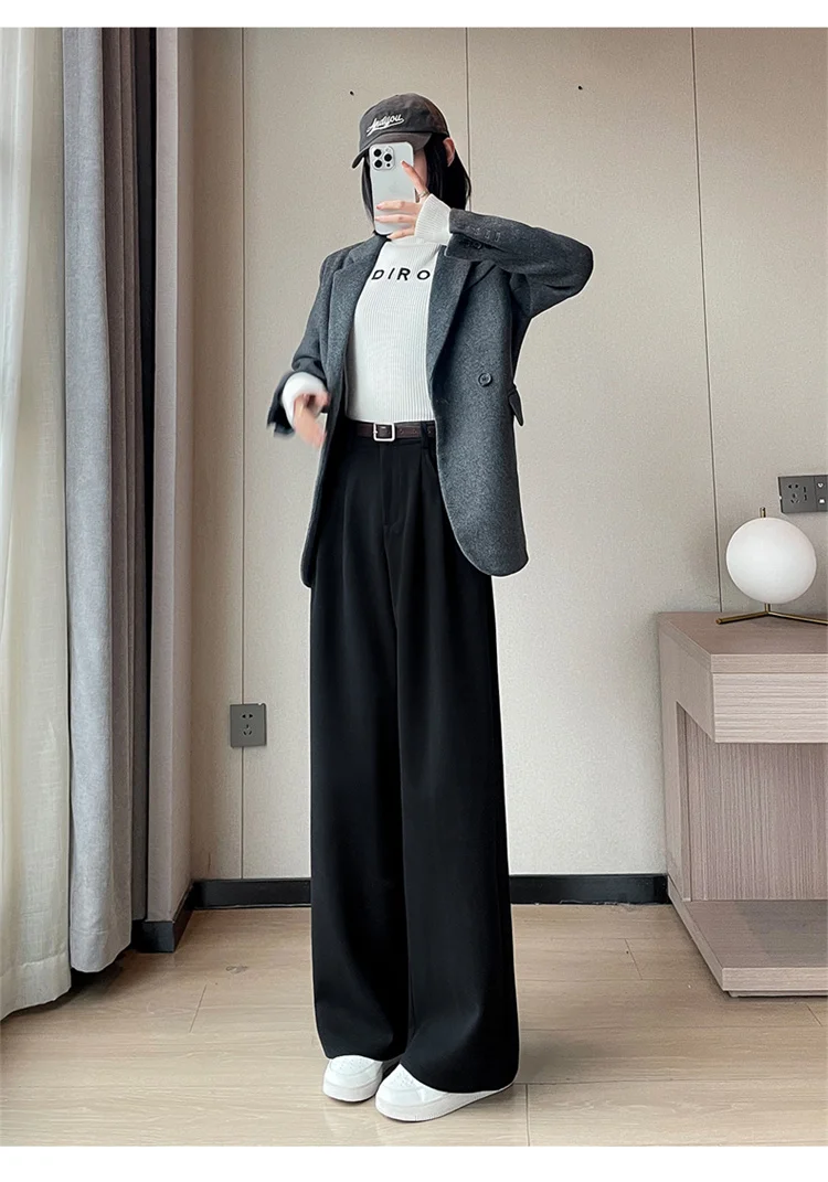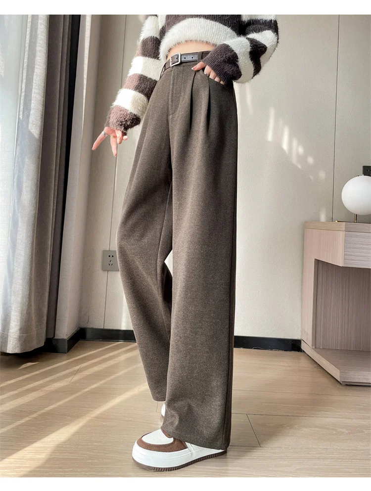 High Quality Woolen Wide Leg Pants Women Streetwear Belt Baggy Black Suit Pants Winter Korean Fashion Casual Straight Trousers