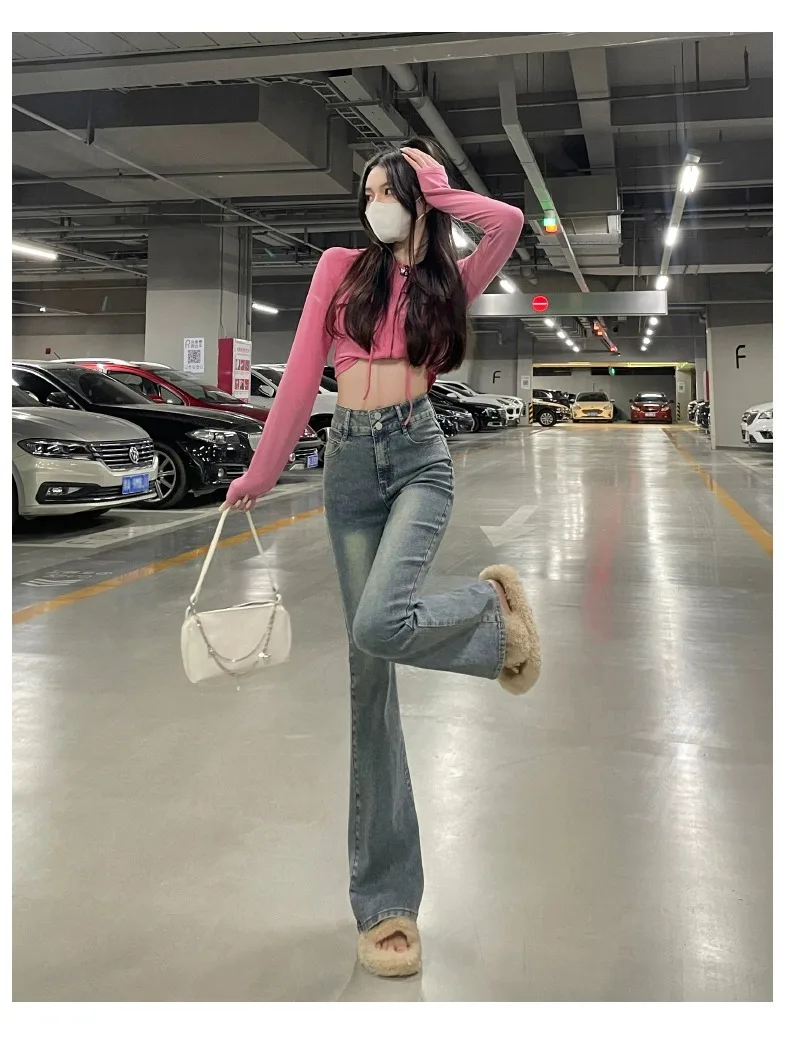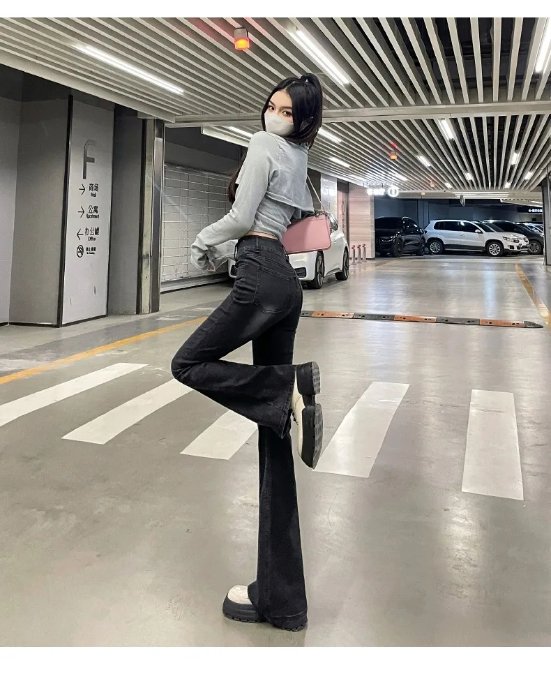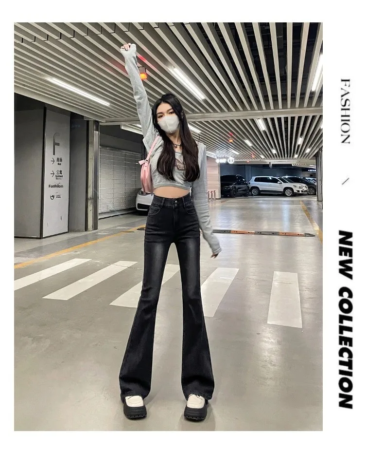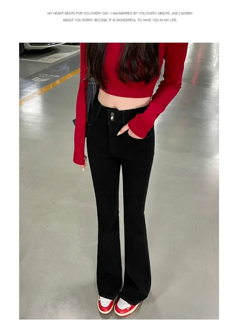 High Waist Fce Lined Thiened Autumn Winter American Bla ey Micro Flared Jeans Women Slimming Legging Hoof Pants