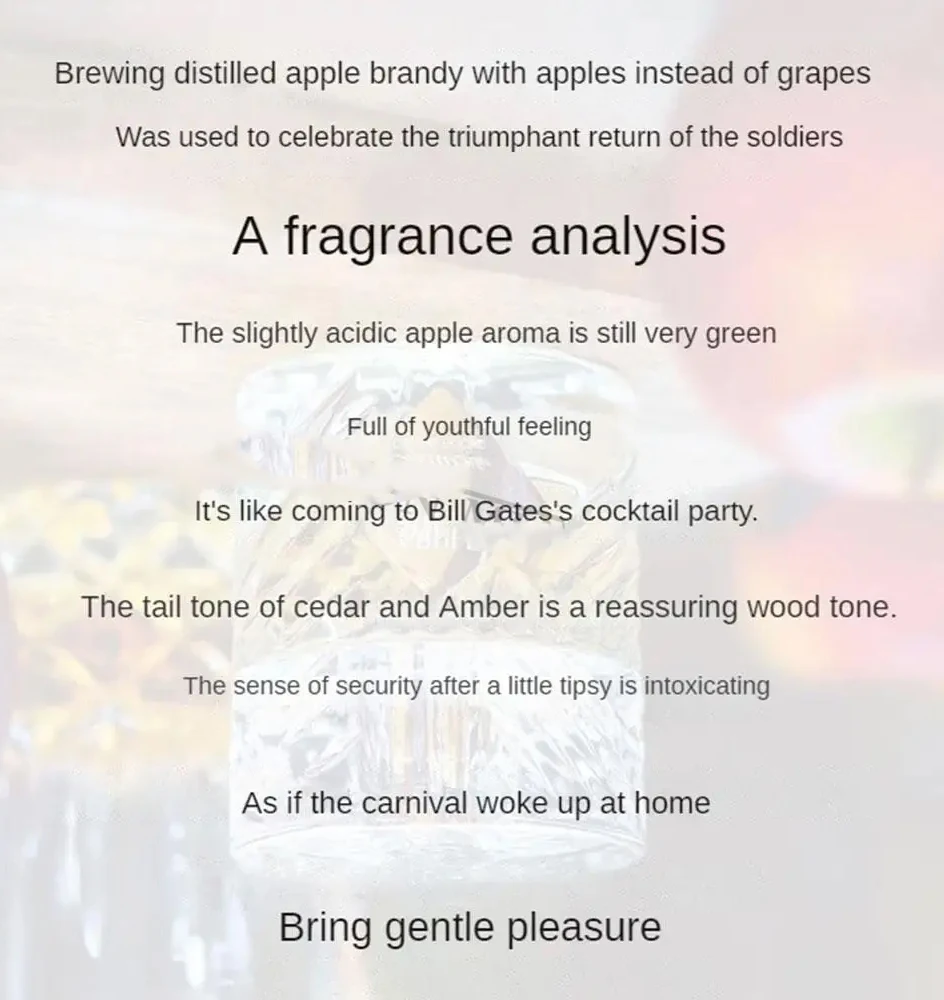 -Analyze: slightly acidic apple aroma is still very green and full of youthfulness, as if coming to the Bill Gates cocktail party, the end of the cedar and amber is reassuringly woody, slightly drunk after the sense of security intoxicated, as if the carnival at home woke up to bring a gentle sense of pleasure!