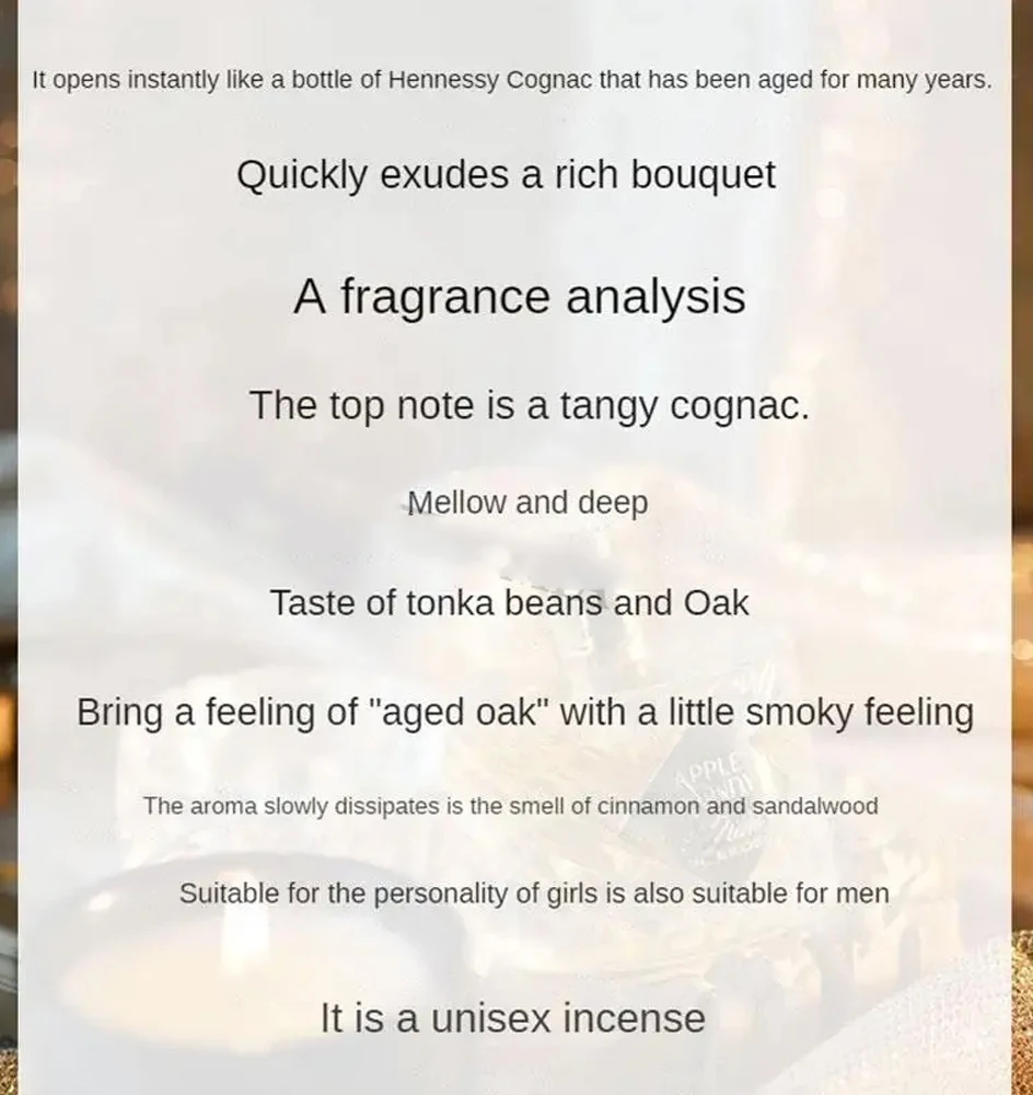 Aroma Analysis: The top note is the nose of the cognac mellow and deep, zero-ling beans and oak flavor, bring a kind of “aged oak” feeling With a little smoky feeling, the aroma slowly dissipate, is the flavor of cinnamon and sandalwood, suitable for personality of the girls, but also suitable for men, it is a unisex aroma!