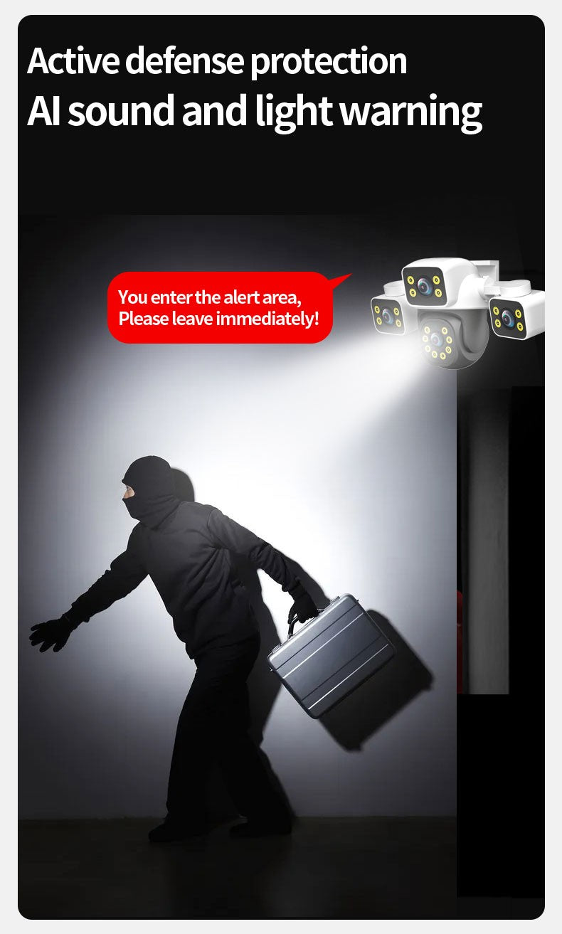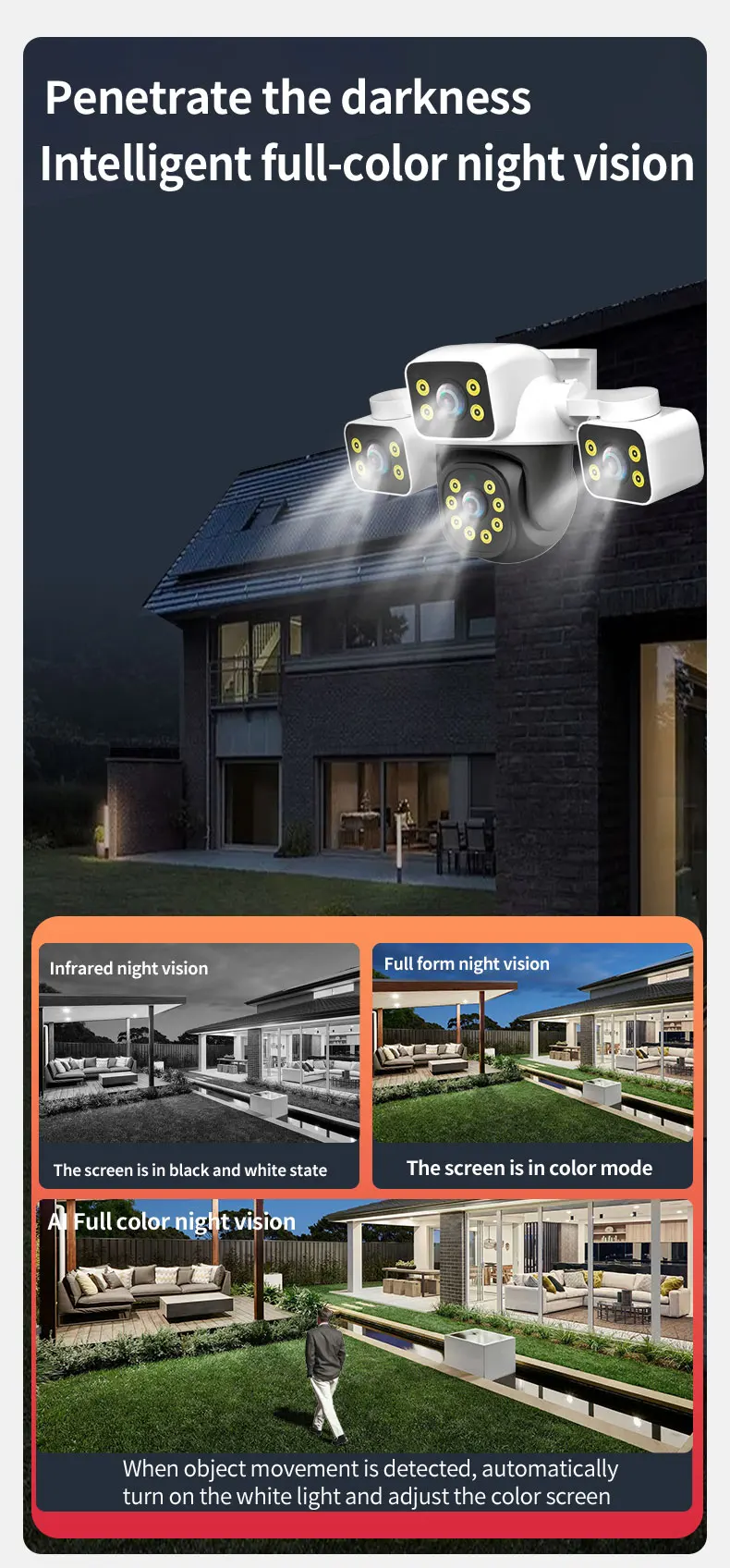 -Built-in infrared LED and white LED, 4+4+4+12mm HD zoom, full color + infrared, night vision 30 meters, to show you a clear, colorful day/night image.