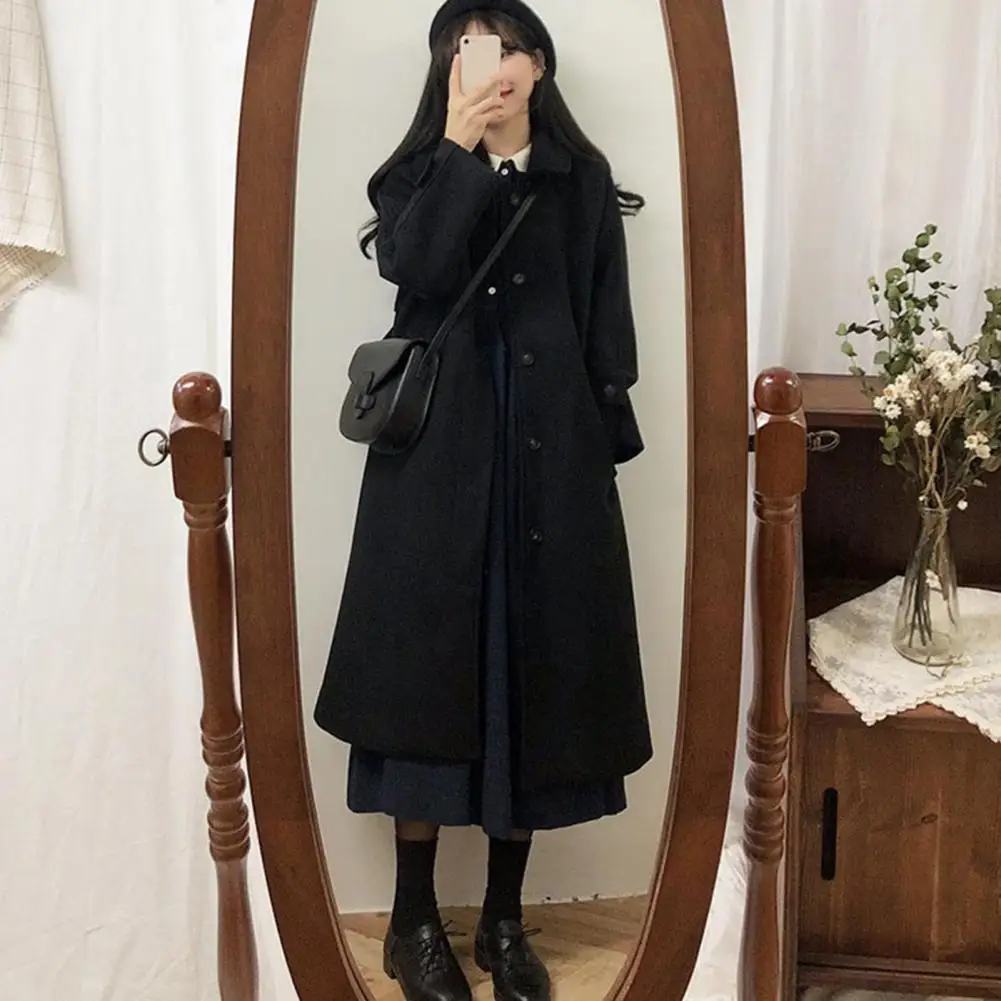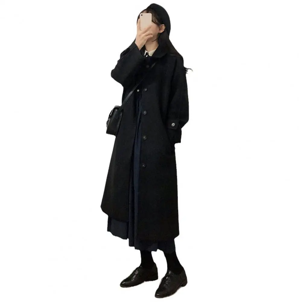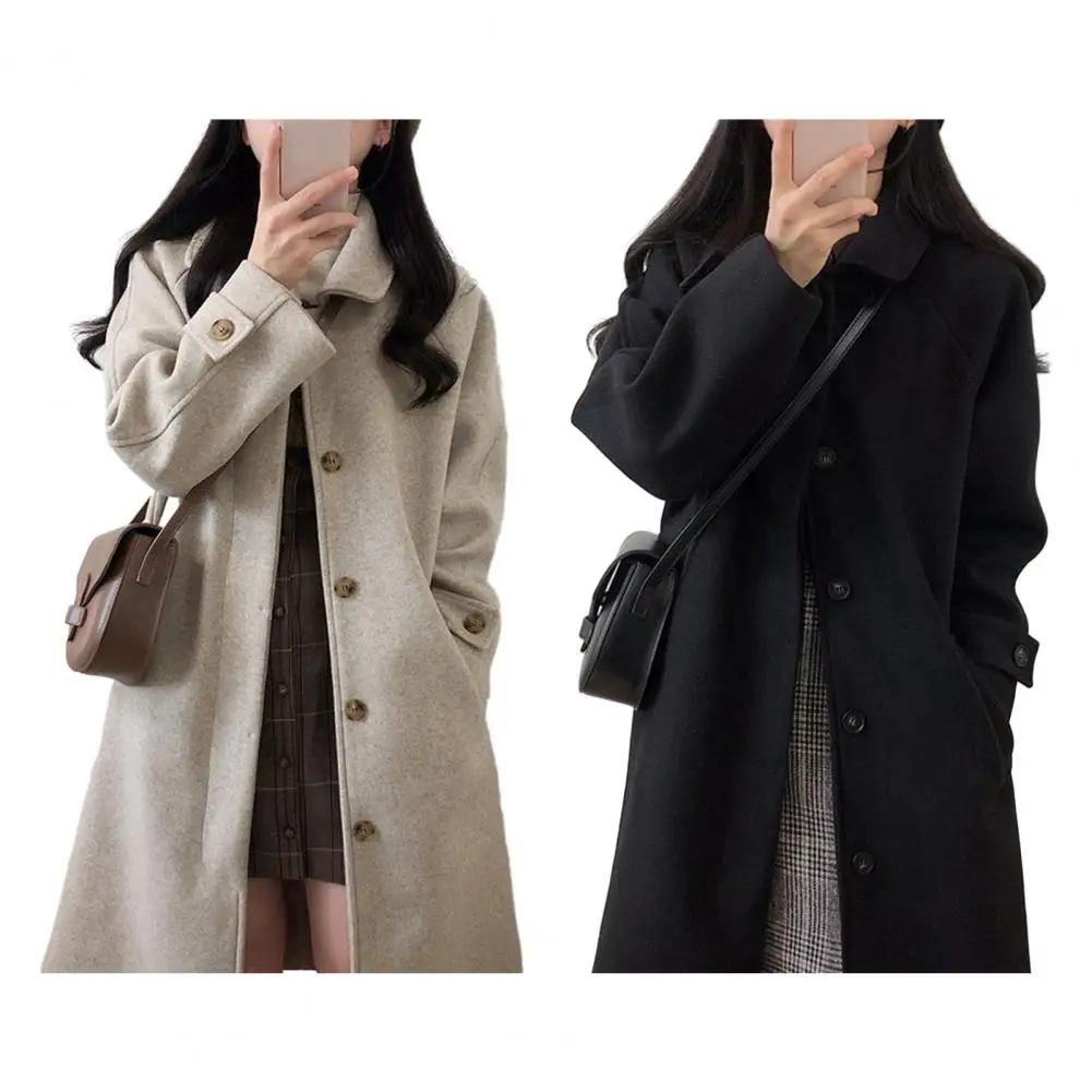 Japanese Style Women Woolen Coat Turn-down Collar Single-breasted Pockets Women Overcoat Front Placket Cardigan Thick Wool Coat