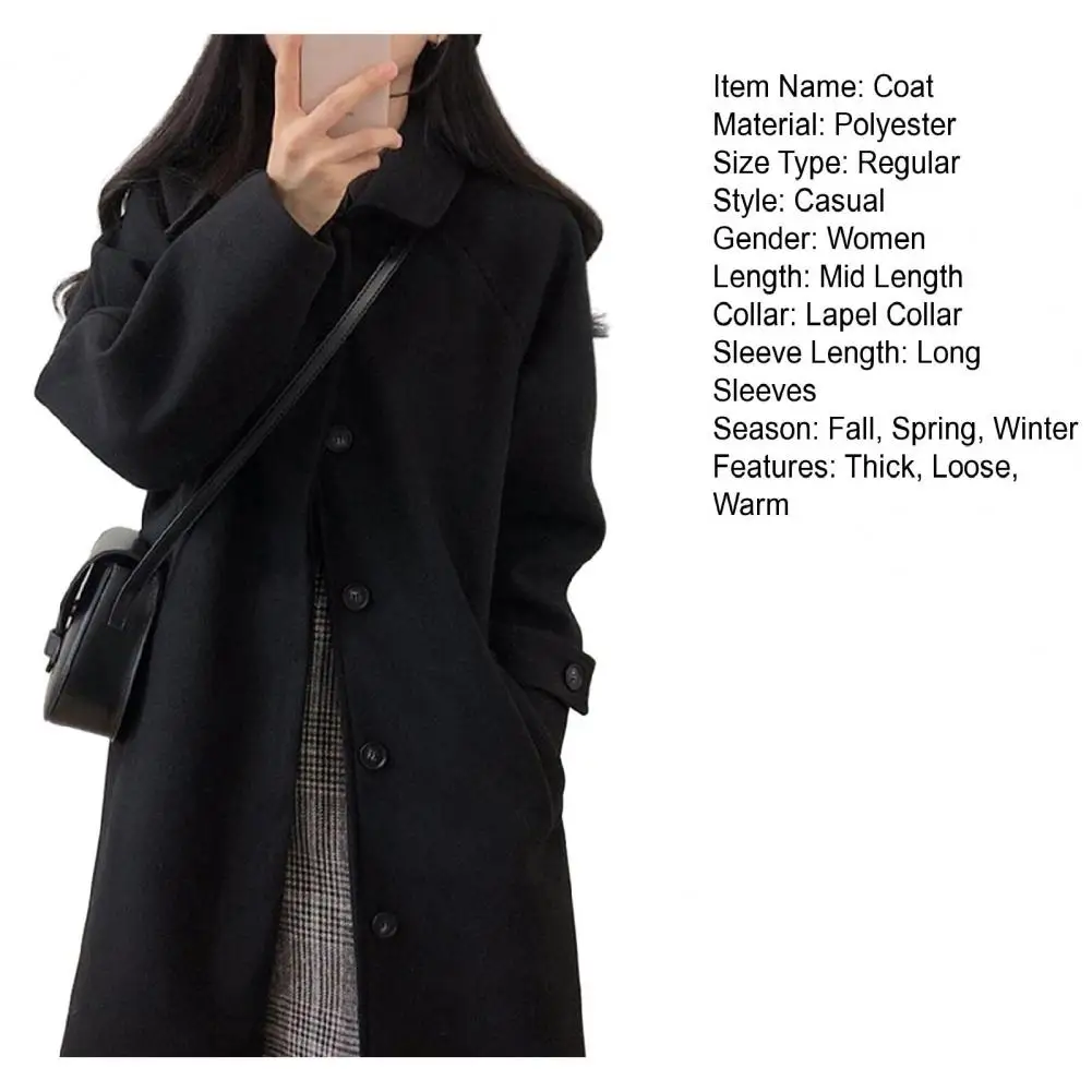 Fall Winter Women Overcoat Turn-down Collar Long Sleeve Single-breasted Pockets Loose Mid Length Solid Color Soft Warm Thick Lady Mid-calf Length Coat