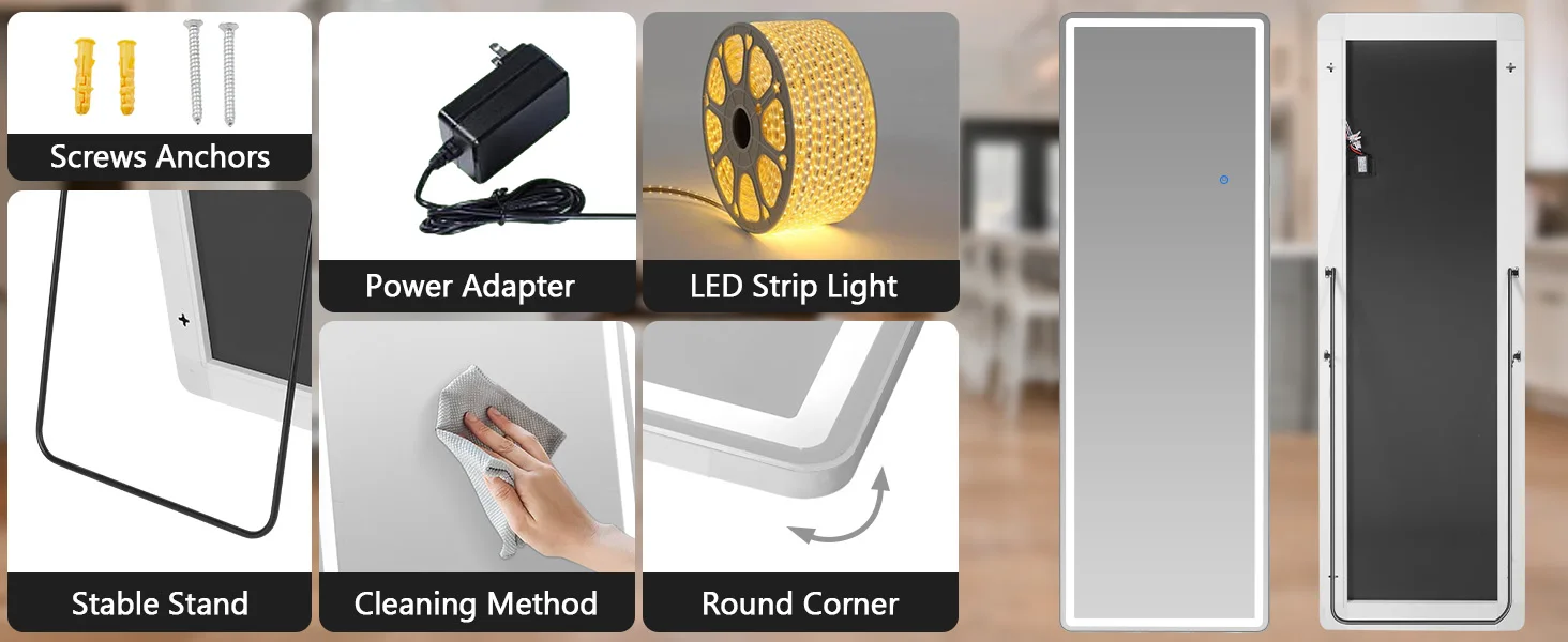 • ALL-MATCH: No Assembly Required. The floor length mirror can stand anywhere with the standing holder. You also can lean it against a wall, or you can hang it horizontally or vertically on the wall for space-saving. It is suitable for a bedroom, living room, cloakroom, home gym, corridor, clothing shop, etc.