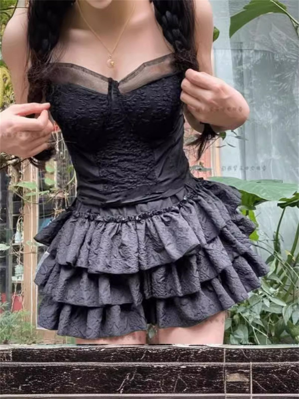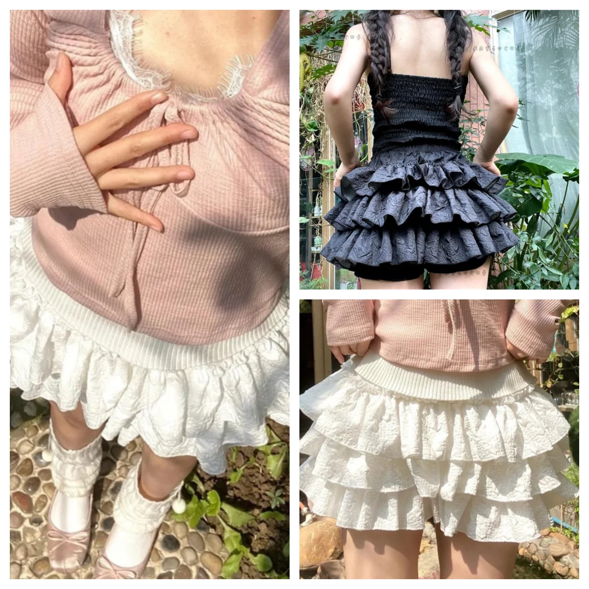 Kawaii Ball Gown Short Skirt Pleated Ruffles Layered High Waist Solid Mini Cake Skirts Lolita Girl Sweet Cute Elastic Waist Y2K
