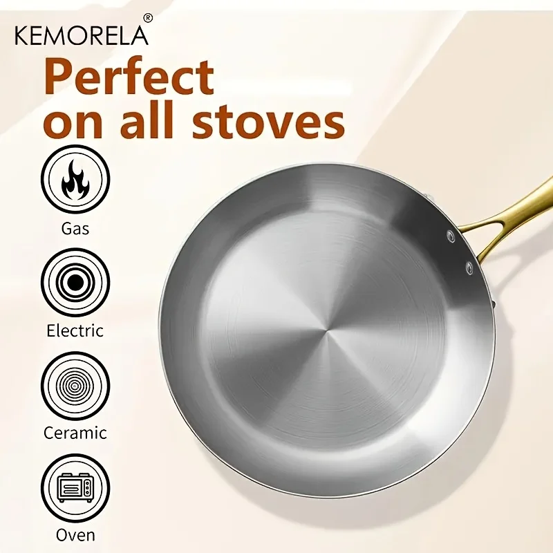 KEMORELA 3PCS 316 Stainless Steel Gold Handle Non-Stick Frying Pan Set 2MM Thick 5-Ply Wok Pan Food Grade Safety Multiple Sizes