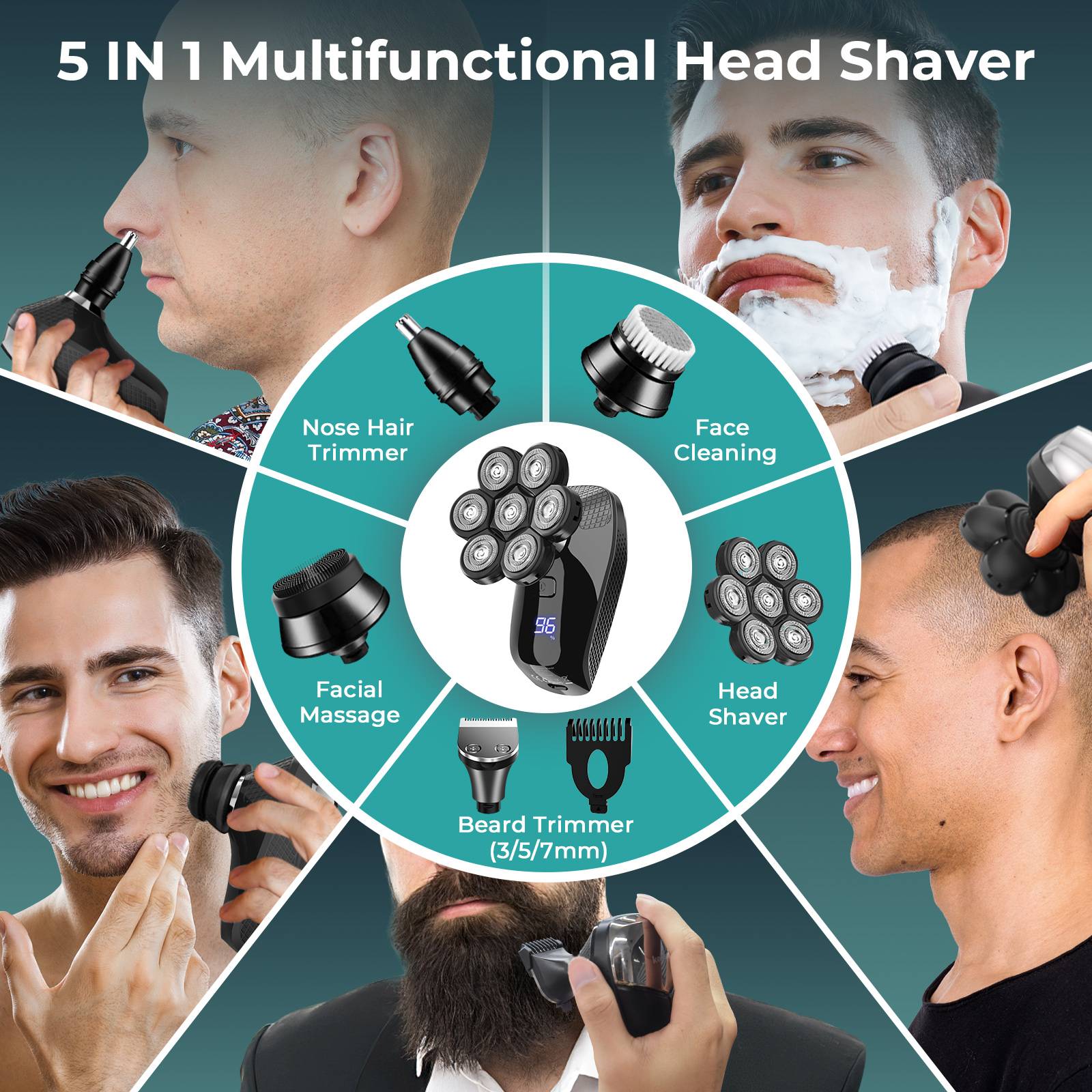 Kensen 5 In 1 USB Rechargeable Bald Head Shavers Kit for Men LED Display 7D Heads Beard Ear Hair Facial Trimmer Electric Shave