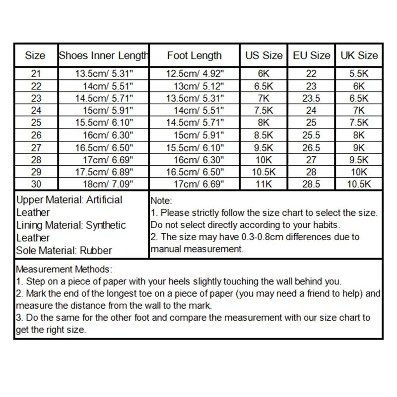 Size 21: Shoes Inner Length 13.5cm(5.31"), Suitable For US Size: 6K, EU Size: 22, UK Size: 5.5K