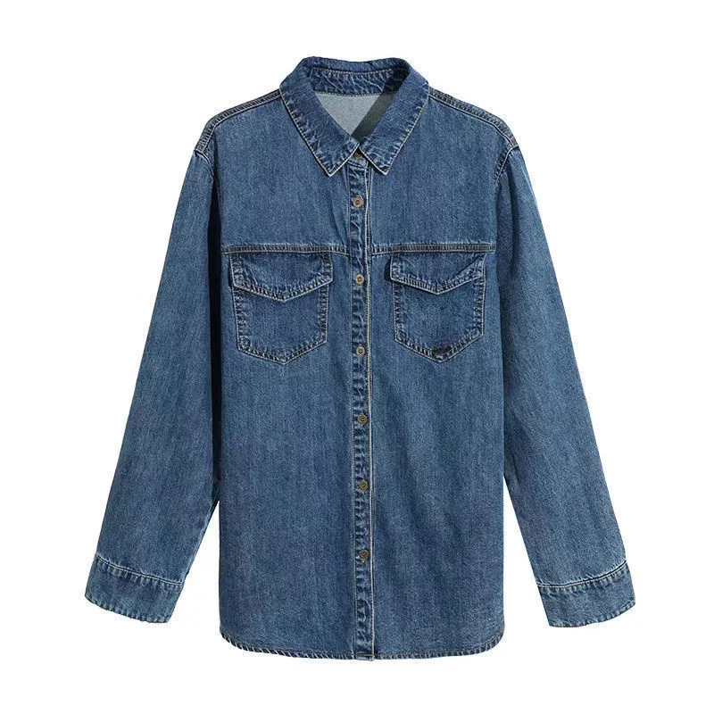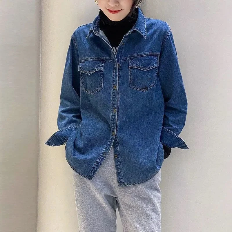 Korean Women Long Sleeve Jeans Shirt With Bottom Tops Coat Retro Style Female Spring Loose Cowboy Cardigan Blouse Denim Jacket