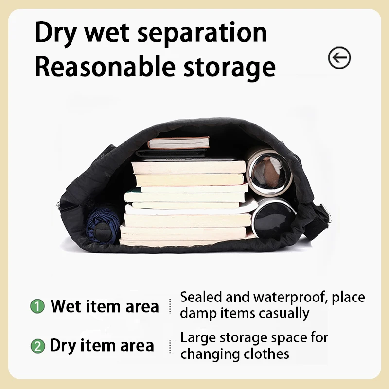 Dry wet separation function to keep the bag dry and clean : The backpack is equipped with an independent wet storage compartment for storing wet towels, swimsuits, or sweatshirts. This dry wet separation design can effectively prevent bacterial growth and keep the bag clean and dry, especially suitable for use after exercise or in humid weather.