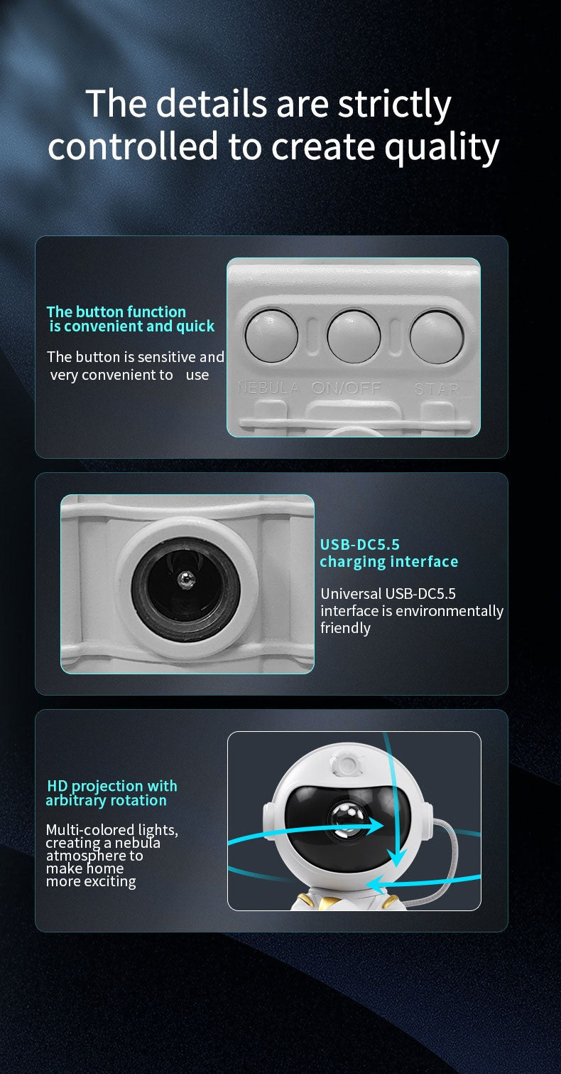 ?Mini night light? Although it is a small mini night light, only the size of the palm of your hand. But this astronaut projection light can create cool starry nebulae.Small size but more suitable for car, desk, playroom, children's room, etc