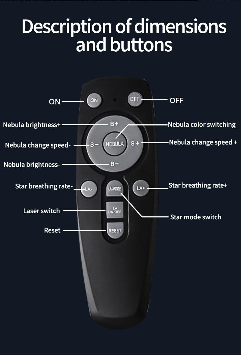 ?Simple and easy to use? The remote control can adjust color of nebula, brightness of nebula, flowing speed of nebula, mode of star changing, brightness of stars, breath speed of stars and On/Off of stars.Of course, there are also adjustment switches on the product for adjusting and long-pressing to turn it off.