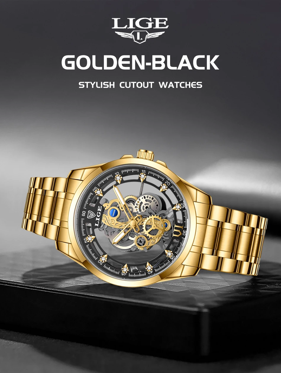 LIGE New Men Watch Skeleton Quartz Wristwatch Gold Skeleton Retro Man Watch Top Brand Luxury Clock Mens Watches Reloj Hombre