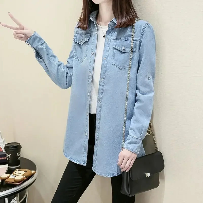 Loose Women's Denim Shirt Long Sleeve Mid-Length Slim Fit plus Size Spring Autumn New Style Student Outerwear Casual Shirt