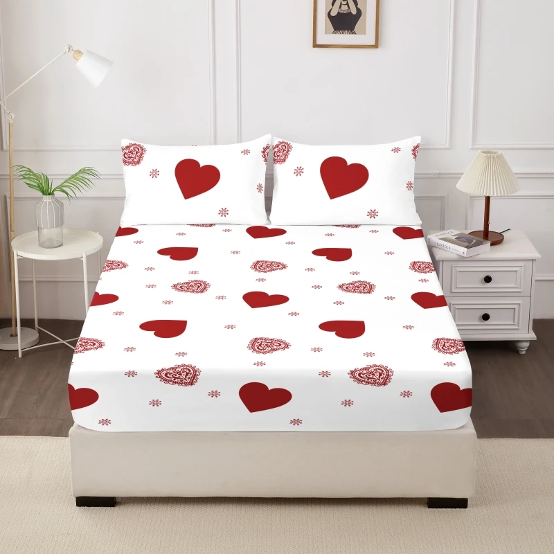 Love Theme Printed Brushed Queen Size Fitted sheet And Pillowcases Set Skin-friendly Bed Cover with Pillowcases For All Seasons