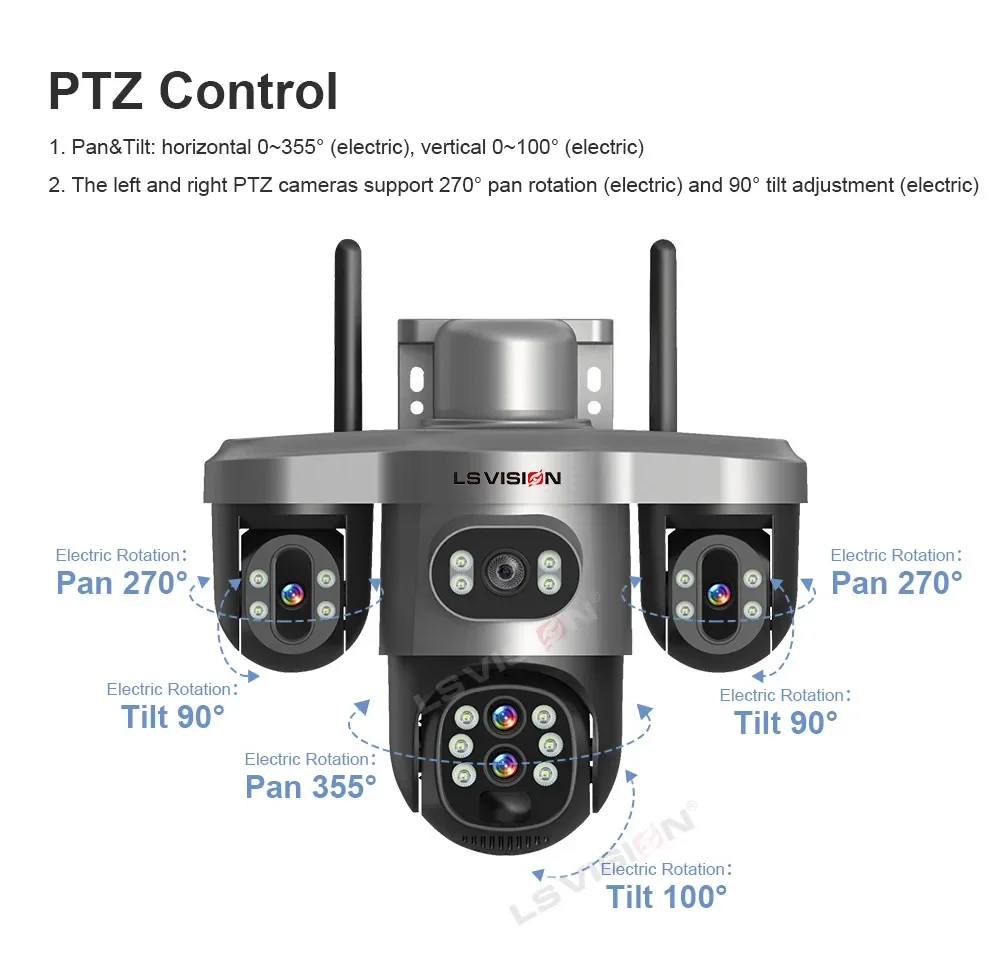 The left and right PTZ cameras support 270° pan rotation (electric) and 90° tilt adjustment (electric)