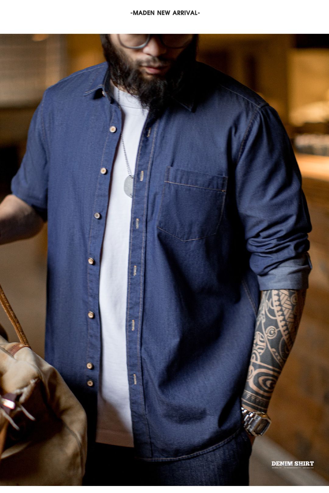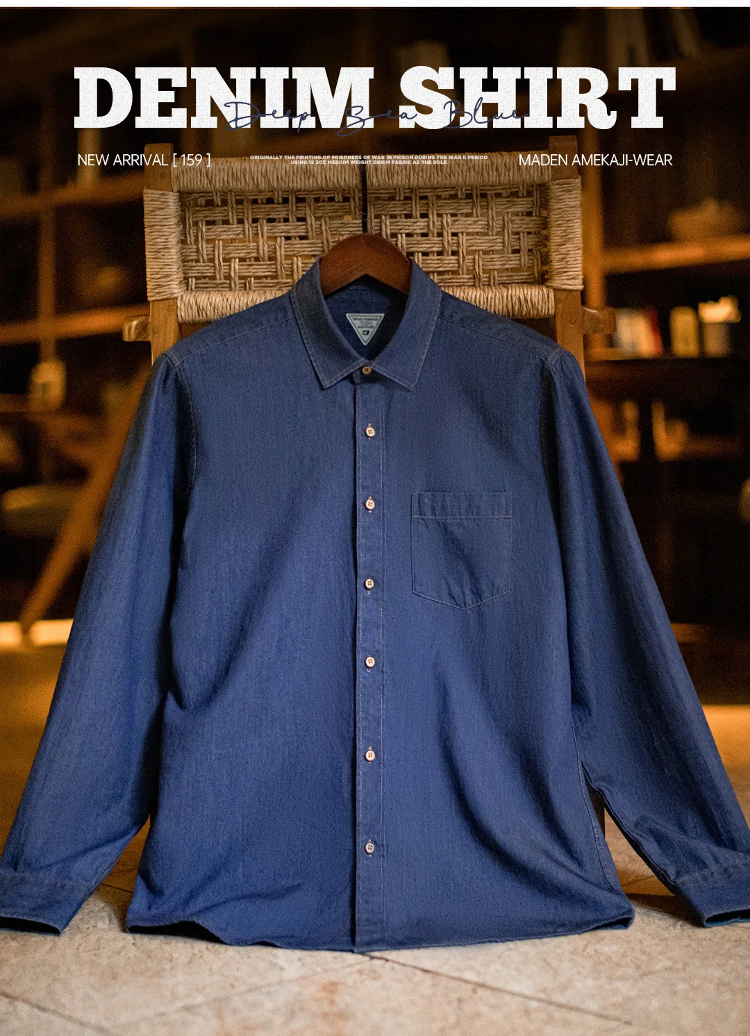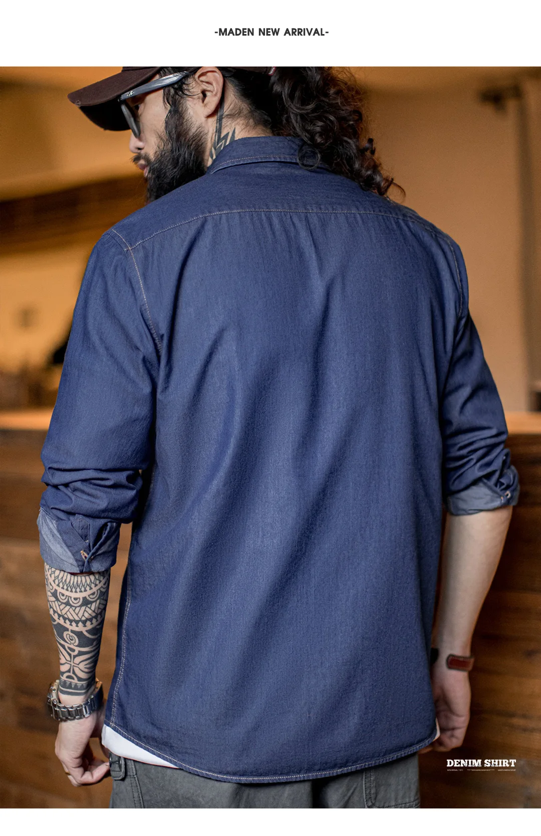 Maden Men Vintage Single Pocket Workwear Denim Shirt Long Sleeved Slim Fit Casual Shirt Single Breasted Turn-Down Collar Blouse