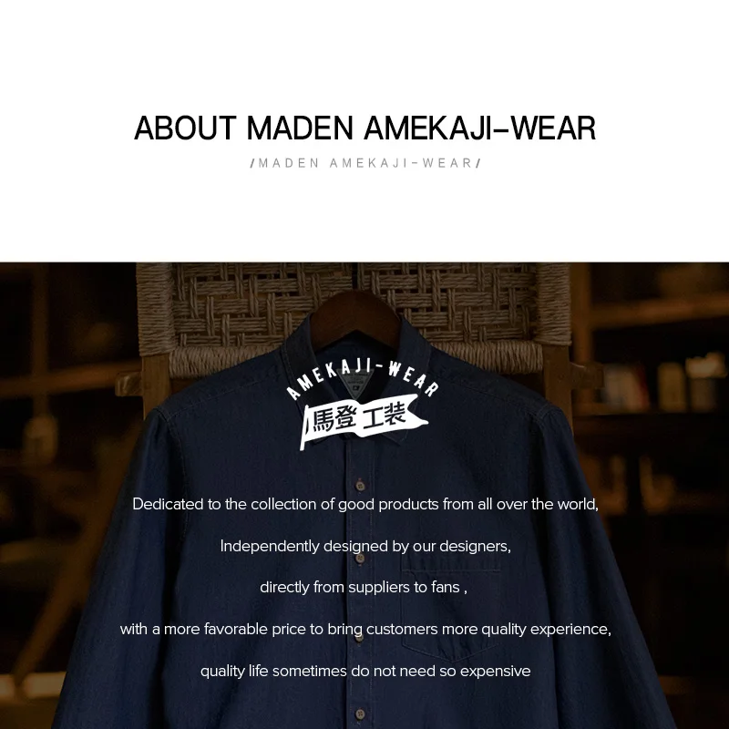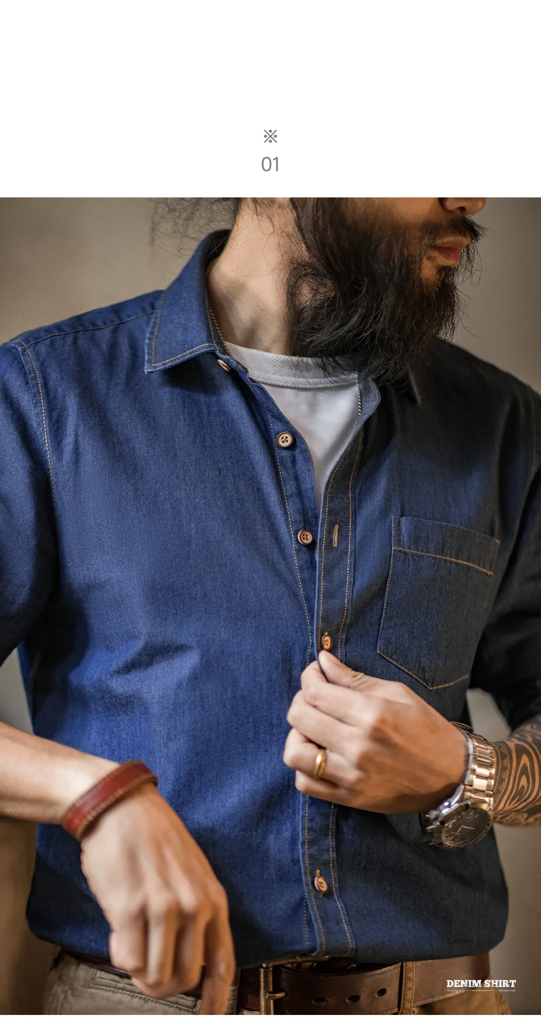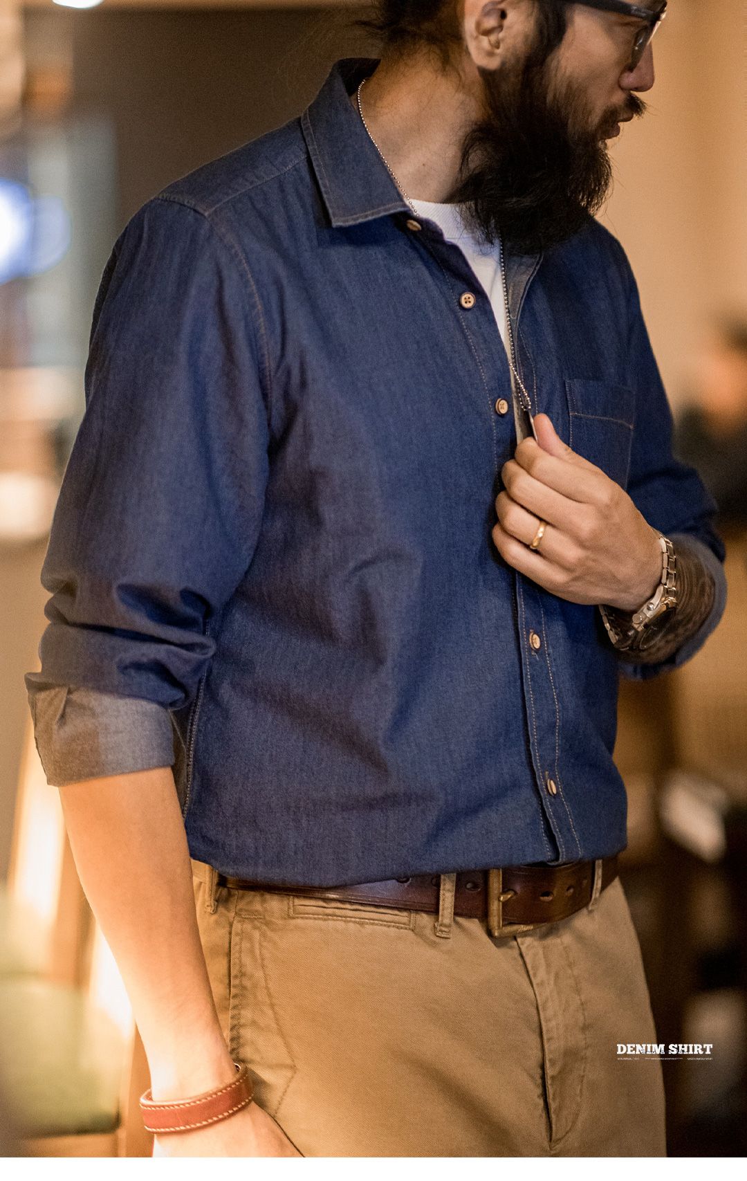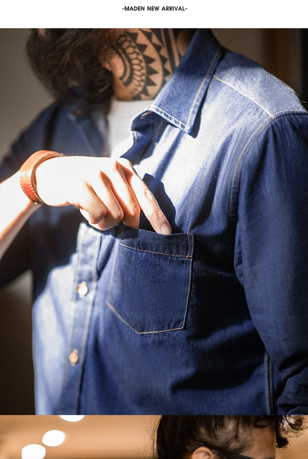 Maden Men Vintage Single Pocket Workwear Denim Shirt Long Sleeved Slim Fit Casual Shirt Single Breasted Turn-Down Collar Blouse