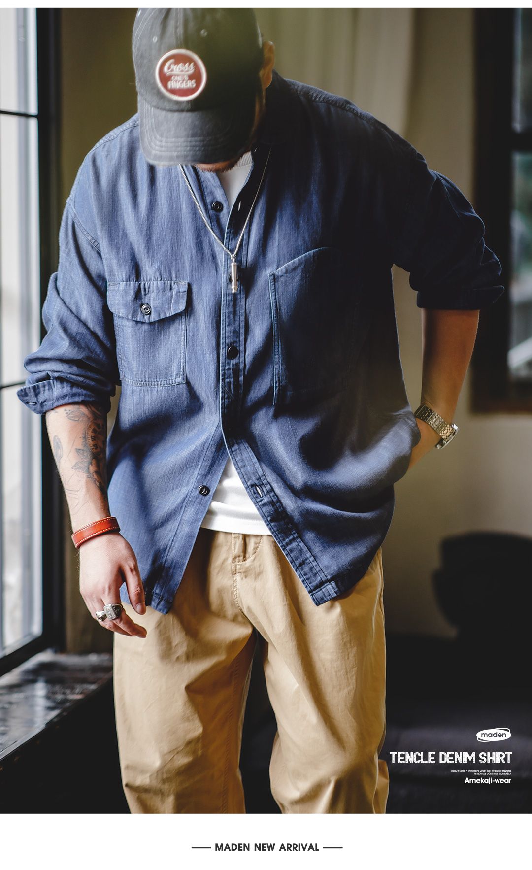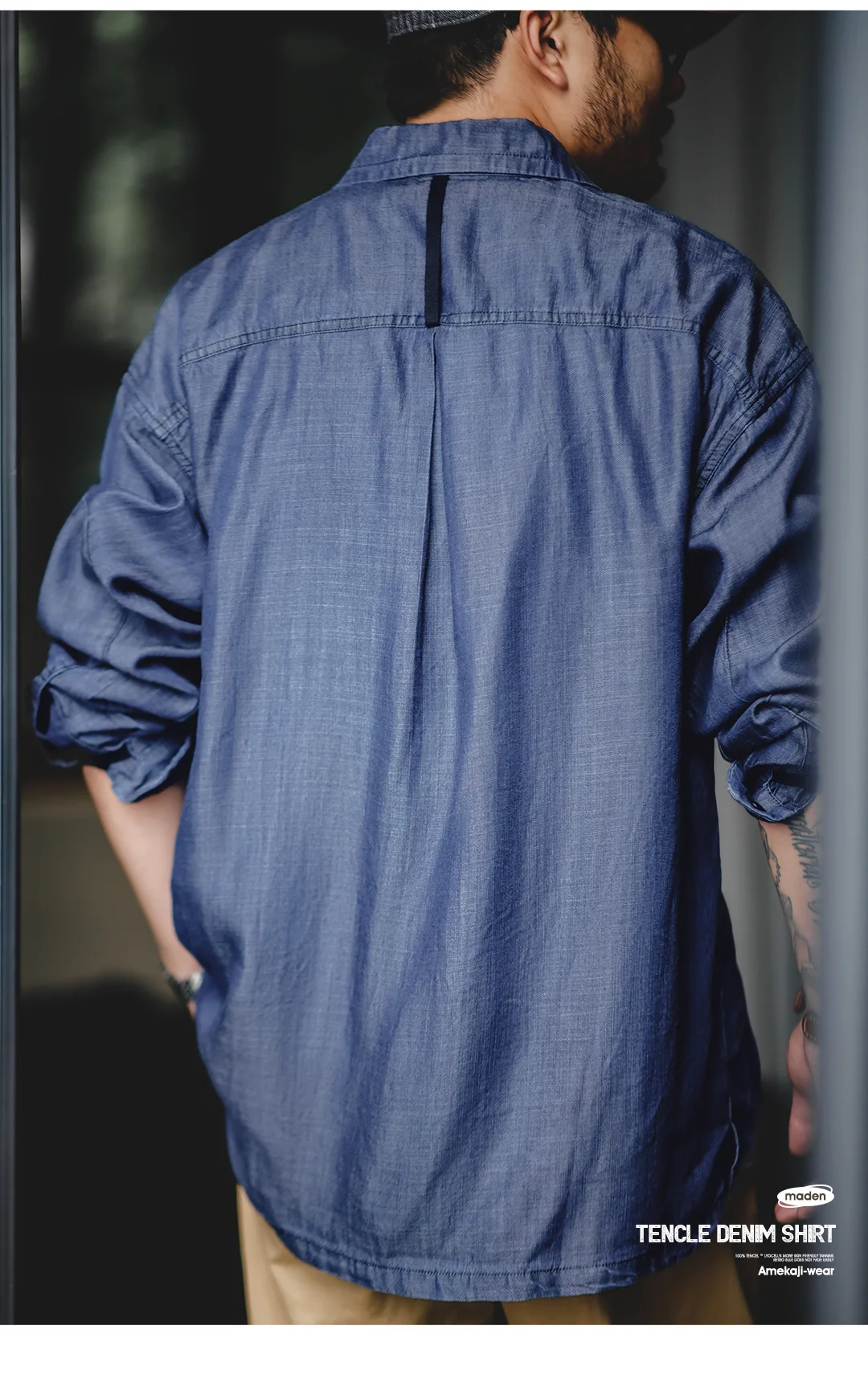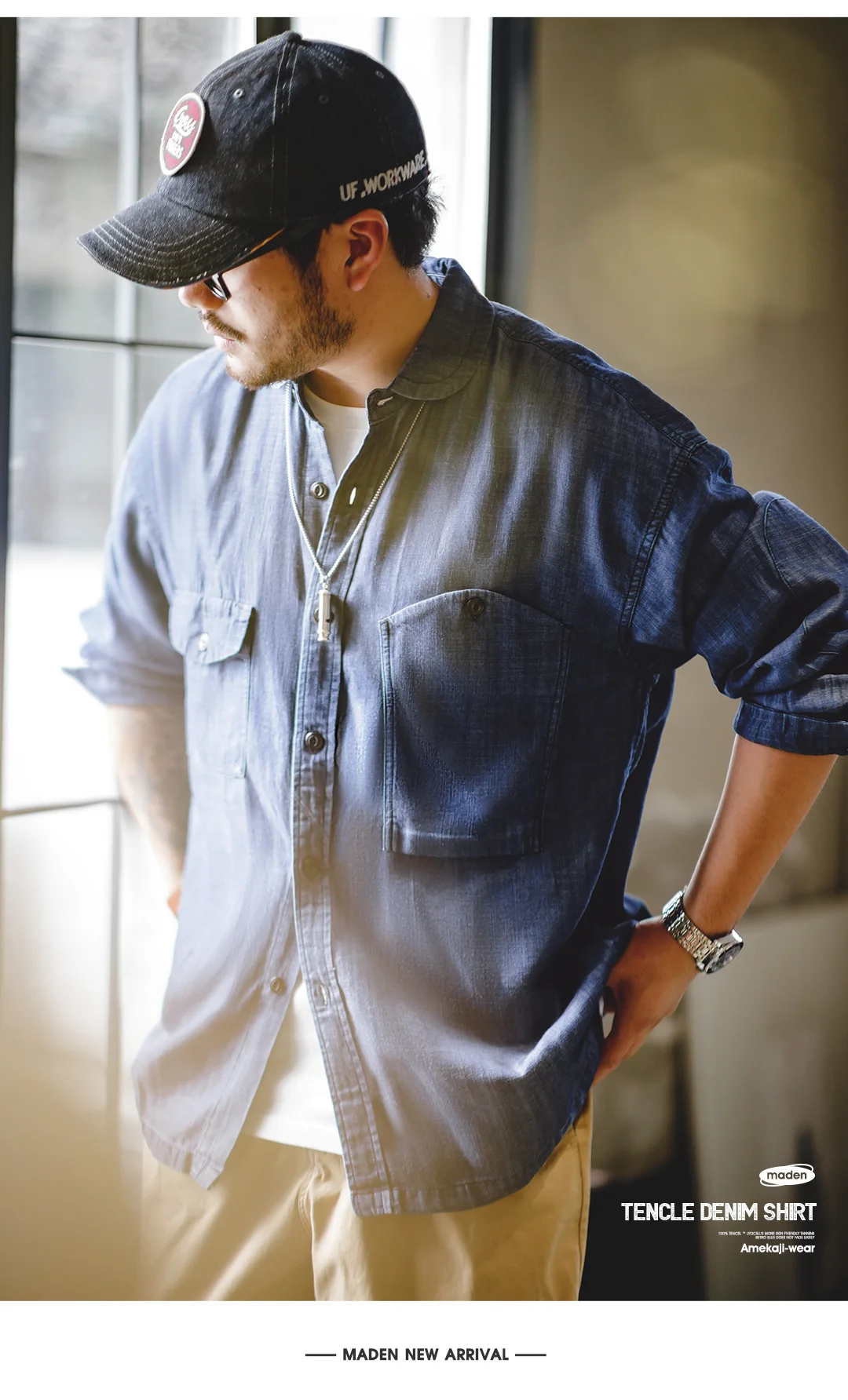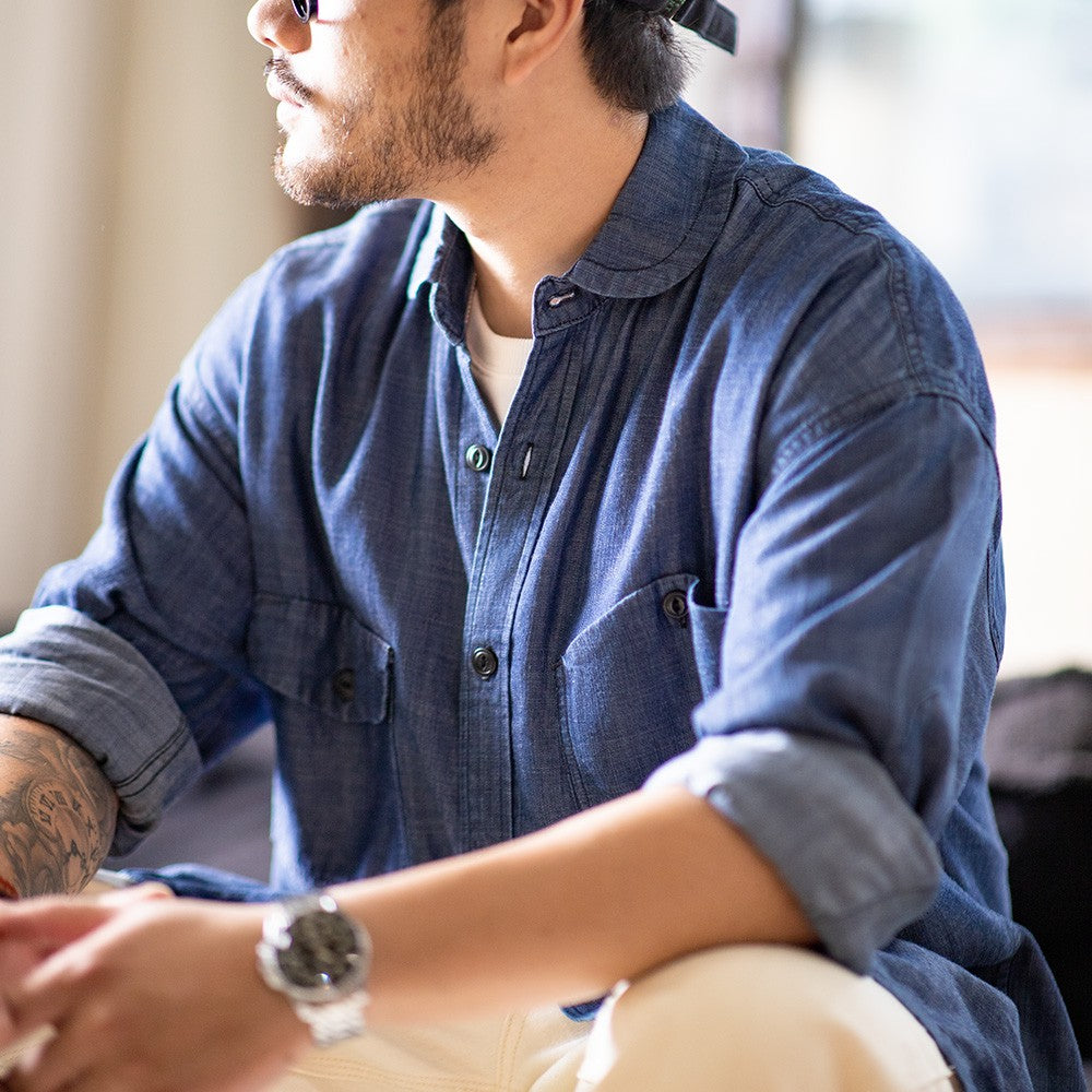 Maden Vintage Denim Shirt for Men's Spring Lightweight CPO Long Sleeve Shirt Lyocell Casual Thin Blue Lapel Collar Blouse