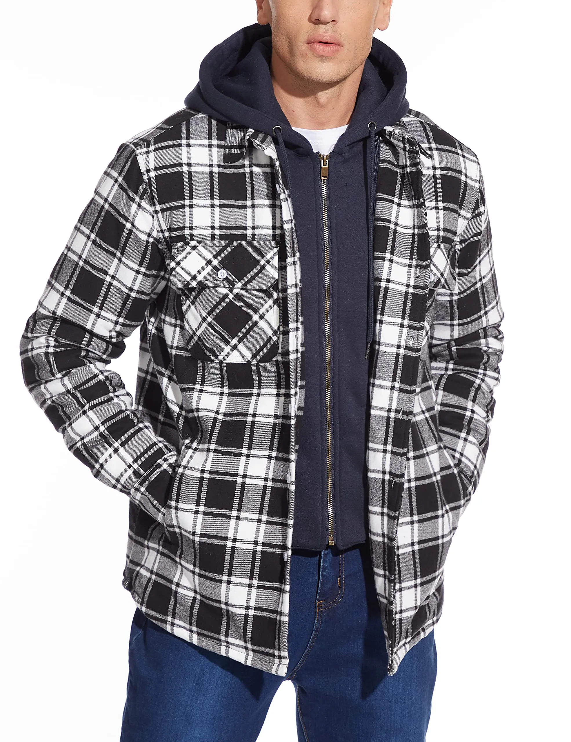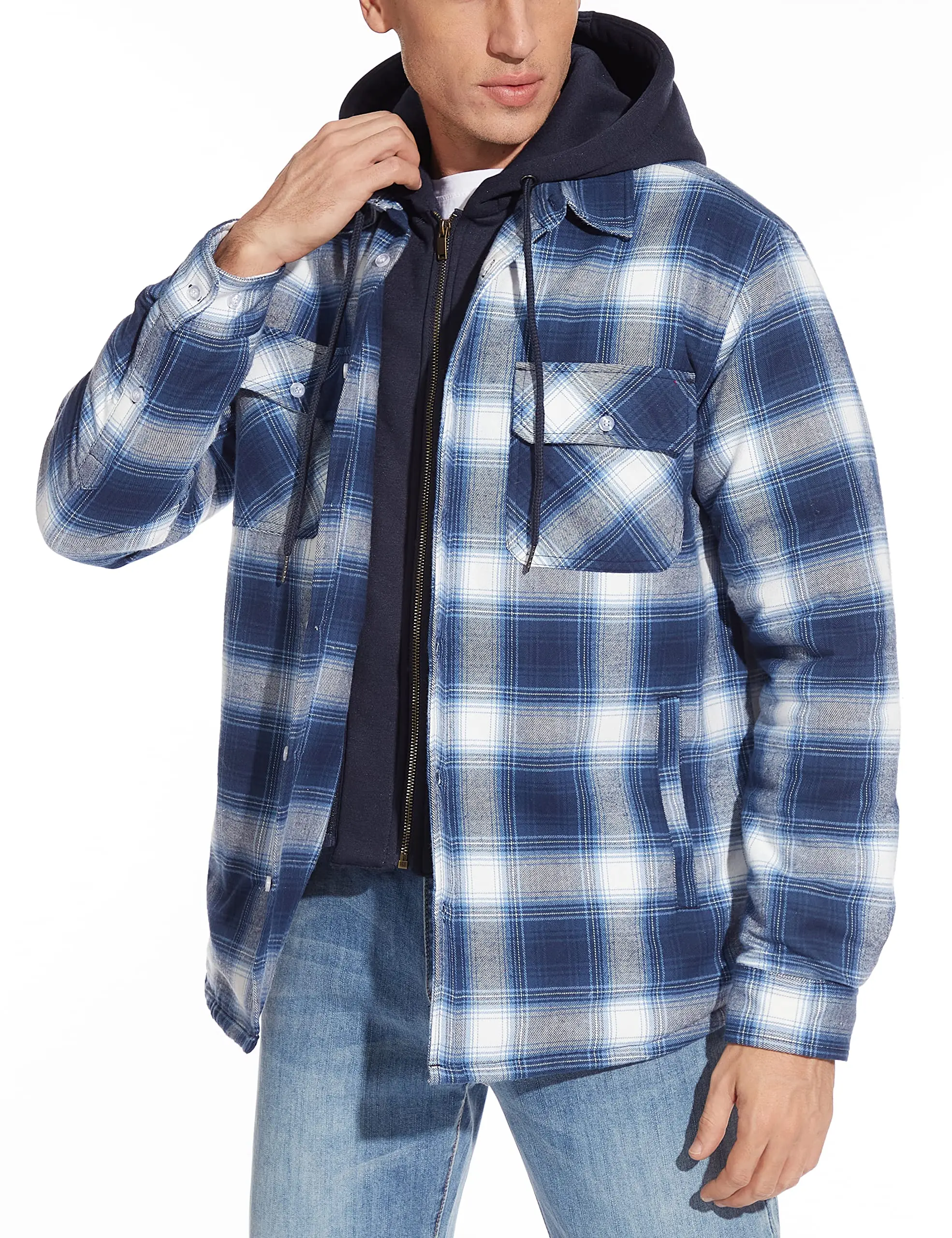 MAGCOMSEN Men's Flannel Jacket with Removable Hood 5 Pockets Plaid Quilted Lined Winter Coats Thick Hoodie Outwear Fleece Jacket