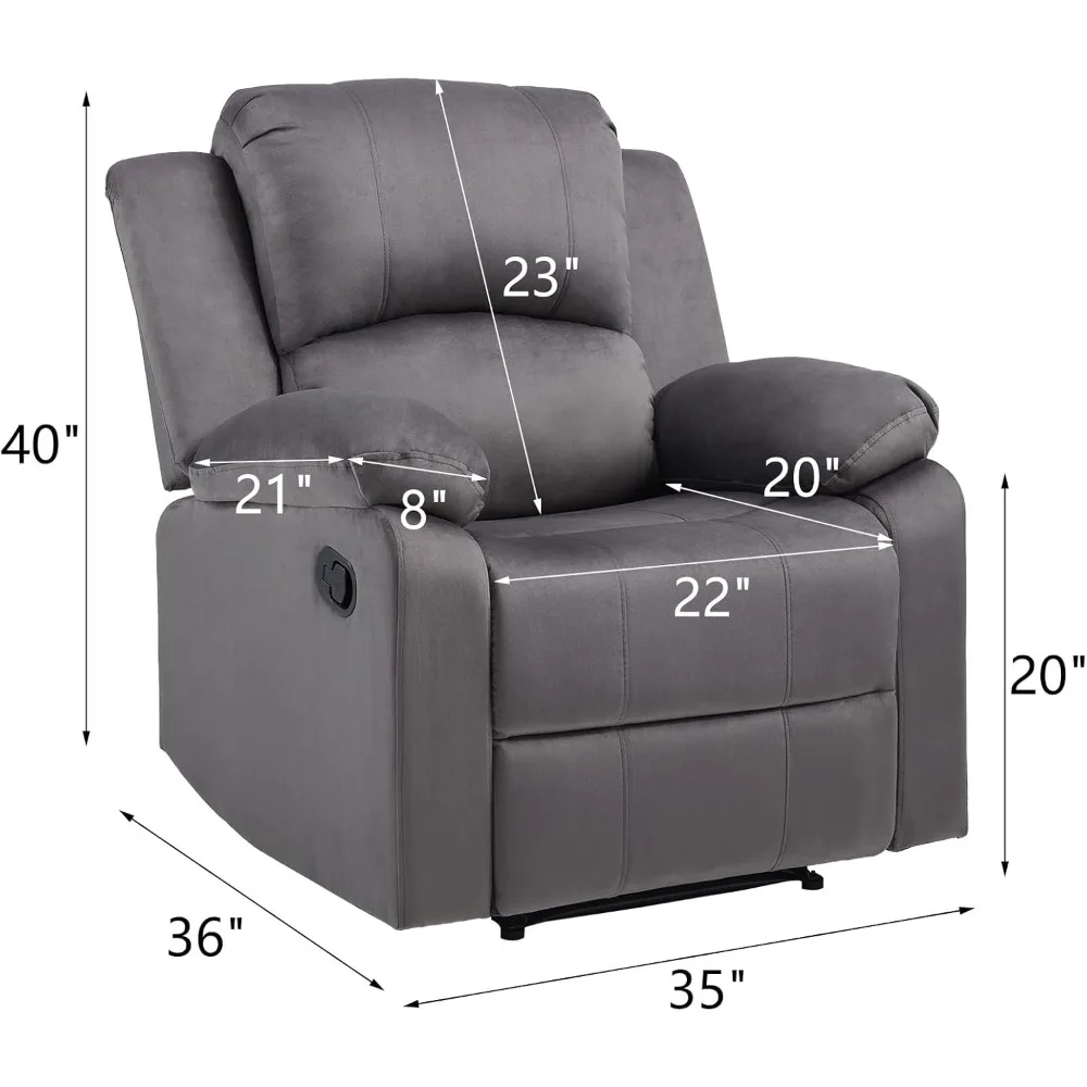 - Dimensions & Color: The dimension of this manual recliner: 36"D x 35"W x 40"Hsuitable for most Americans. Relax in this reclining chair for unprecedented comfort. Gray reclining chairs adorn your living room with a modern feel.