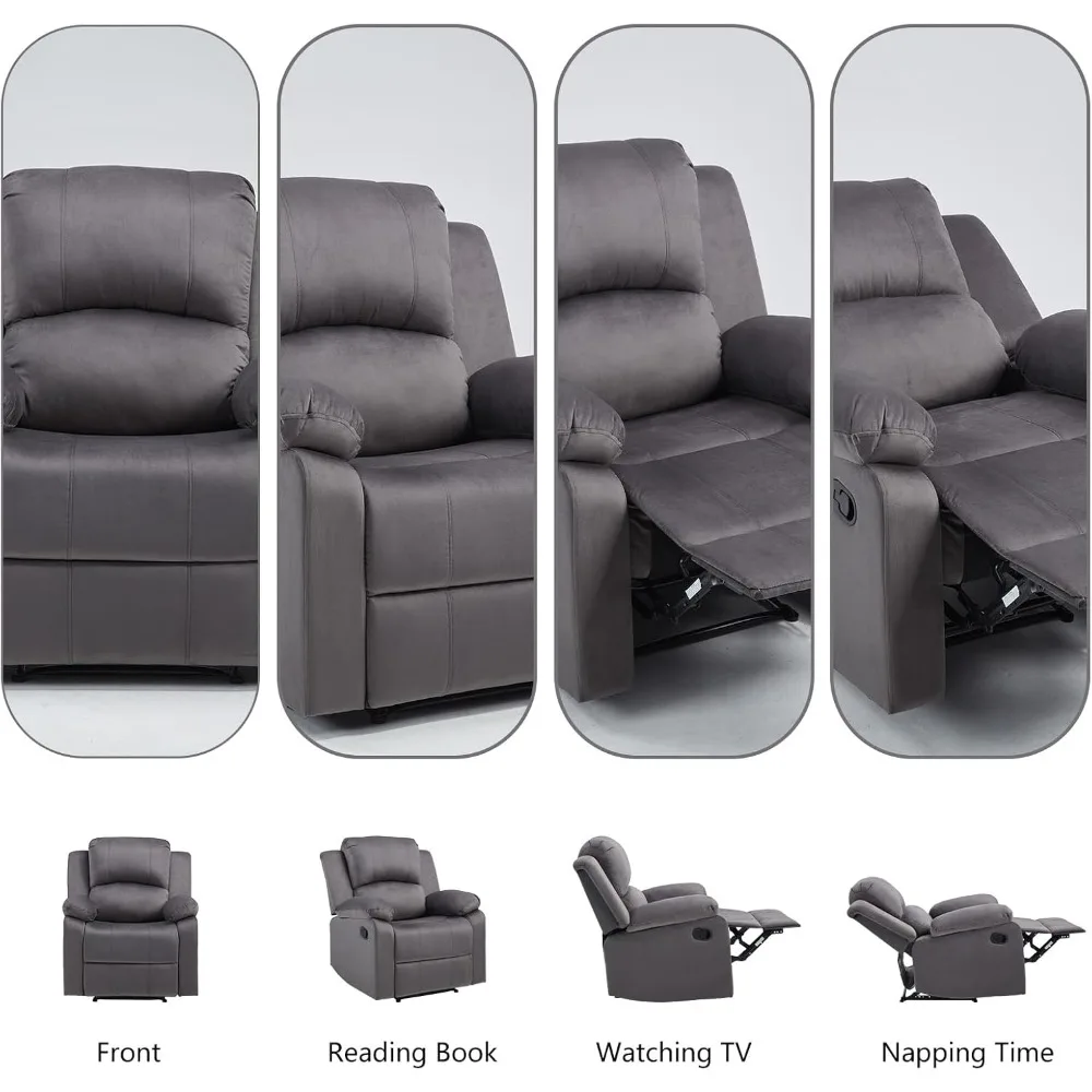 - Comfortable Material: The fabric of the recliner is short plush, which is soft to the touch. This recliner chair is filled with enough sponge to offer the user adequate back & lumbar support. And provide a safe and warm "harbour" to help you dispel stress and fatigue.