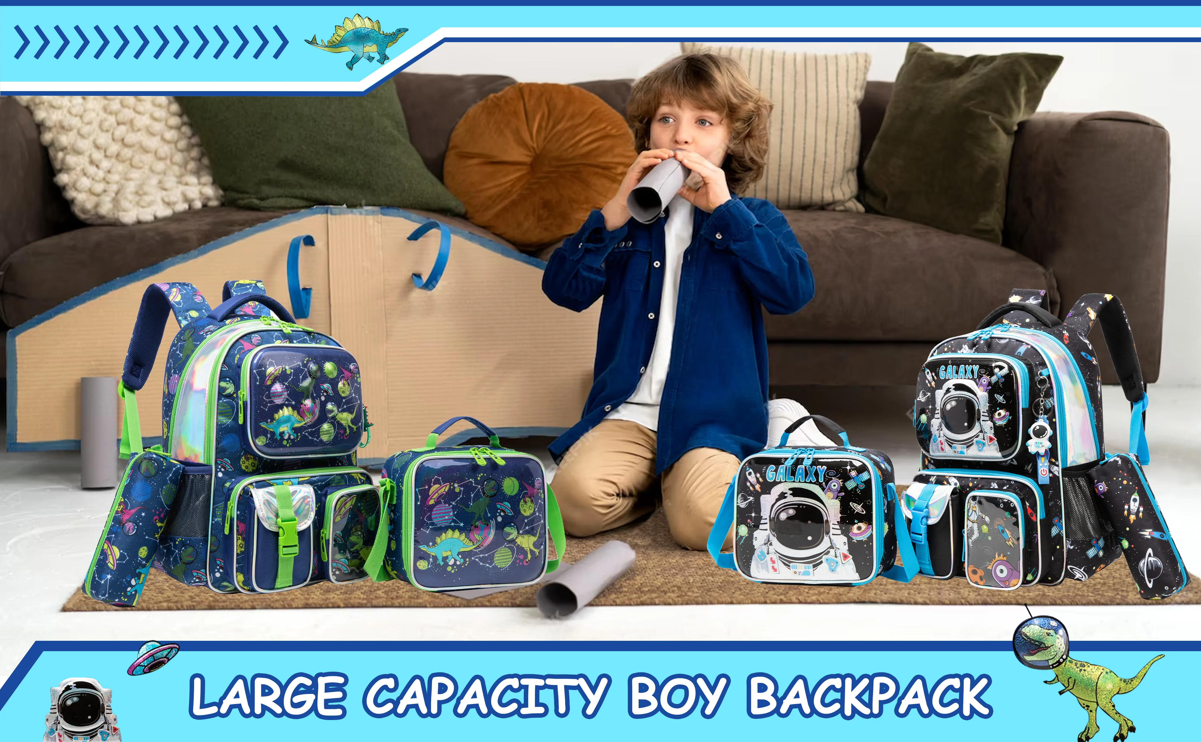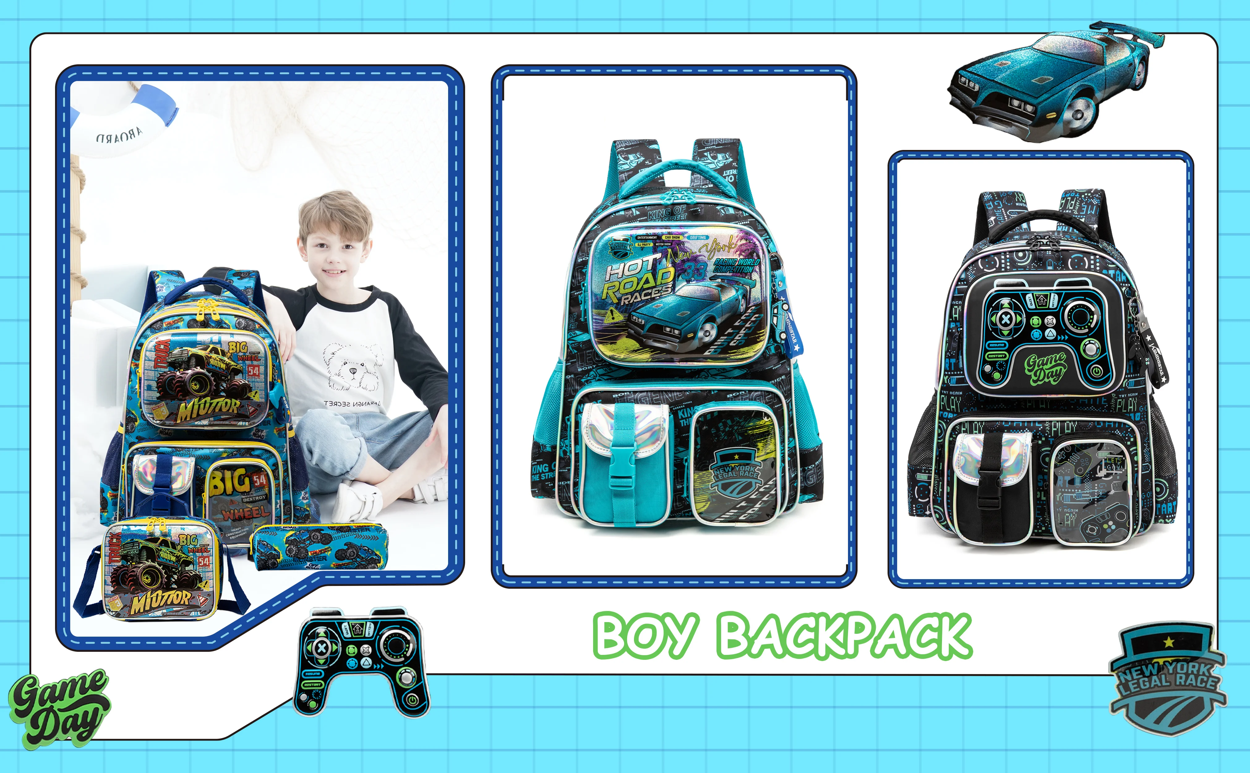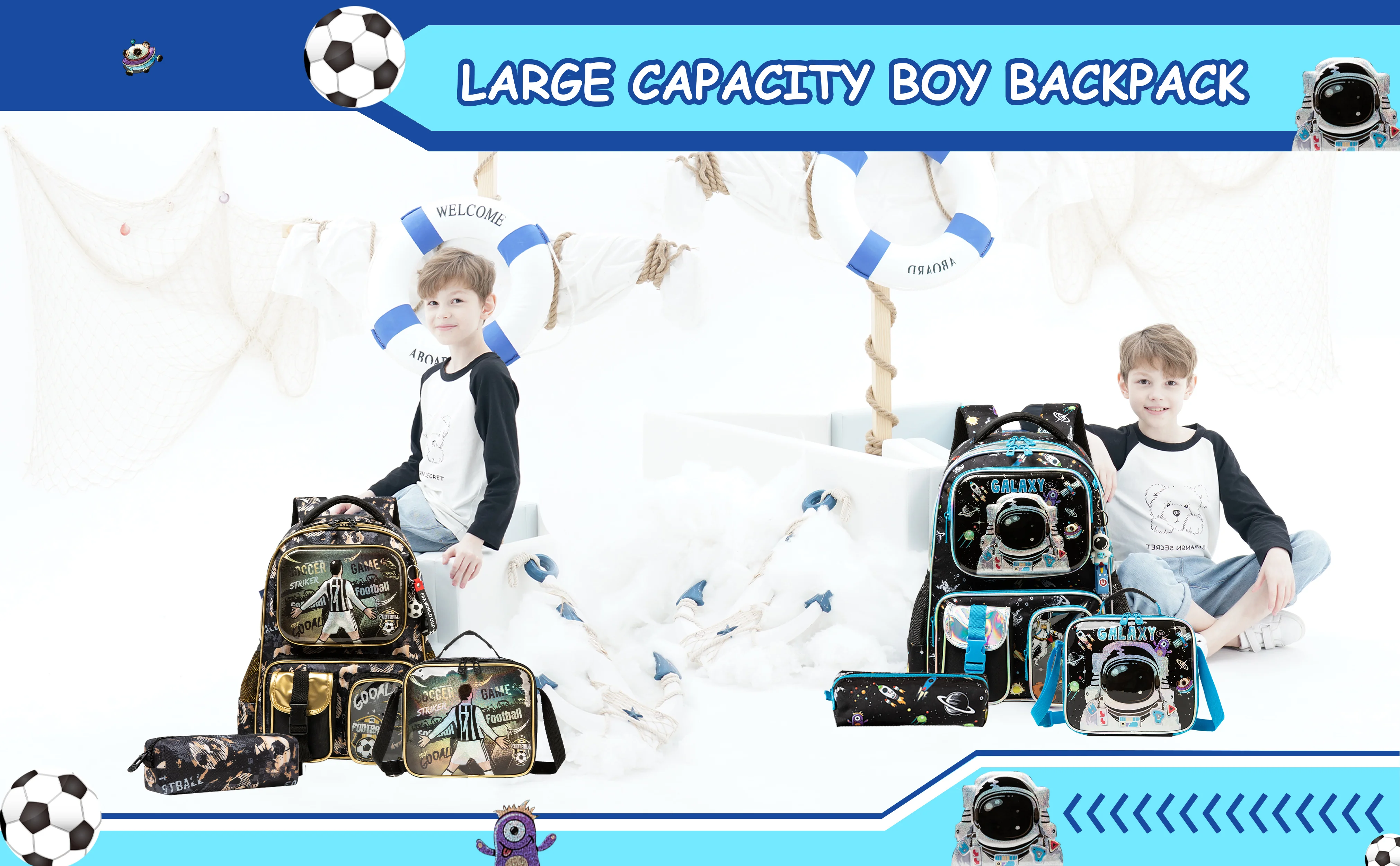 [Boys Backpack Large Capacity]The backpack main compartment contains laptop pocket,fits for 15.6" laptop, iPad, folders, A4 magazines, books, wallet, kawaii dolls;Front small pockets fits for notebook,keys,snacks or anything else you need in your daily life.2 side mesh pocket fit for bottle and umbrella.