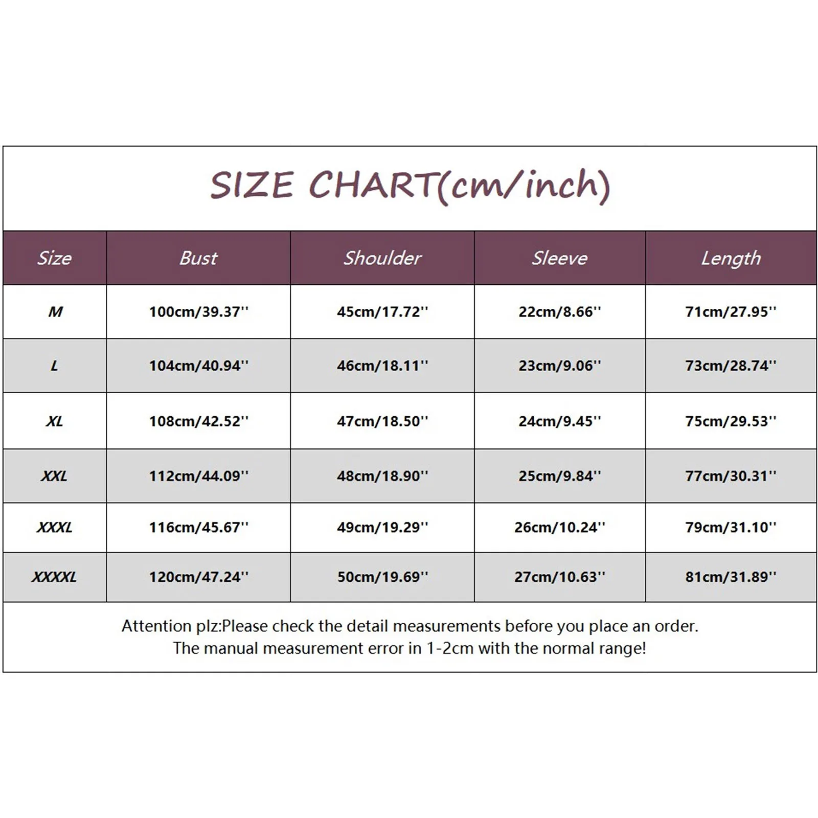 | Size:XXXXL | bust:120cm/47.24'' | Shoulder:50cm/19.69'' | Sleeve:27cm/10.63'' | Length:81cm/31.89'' |