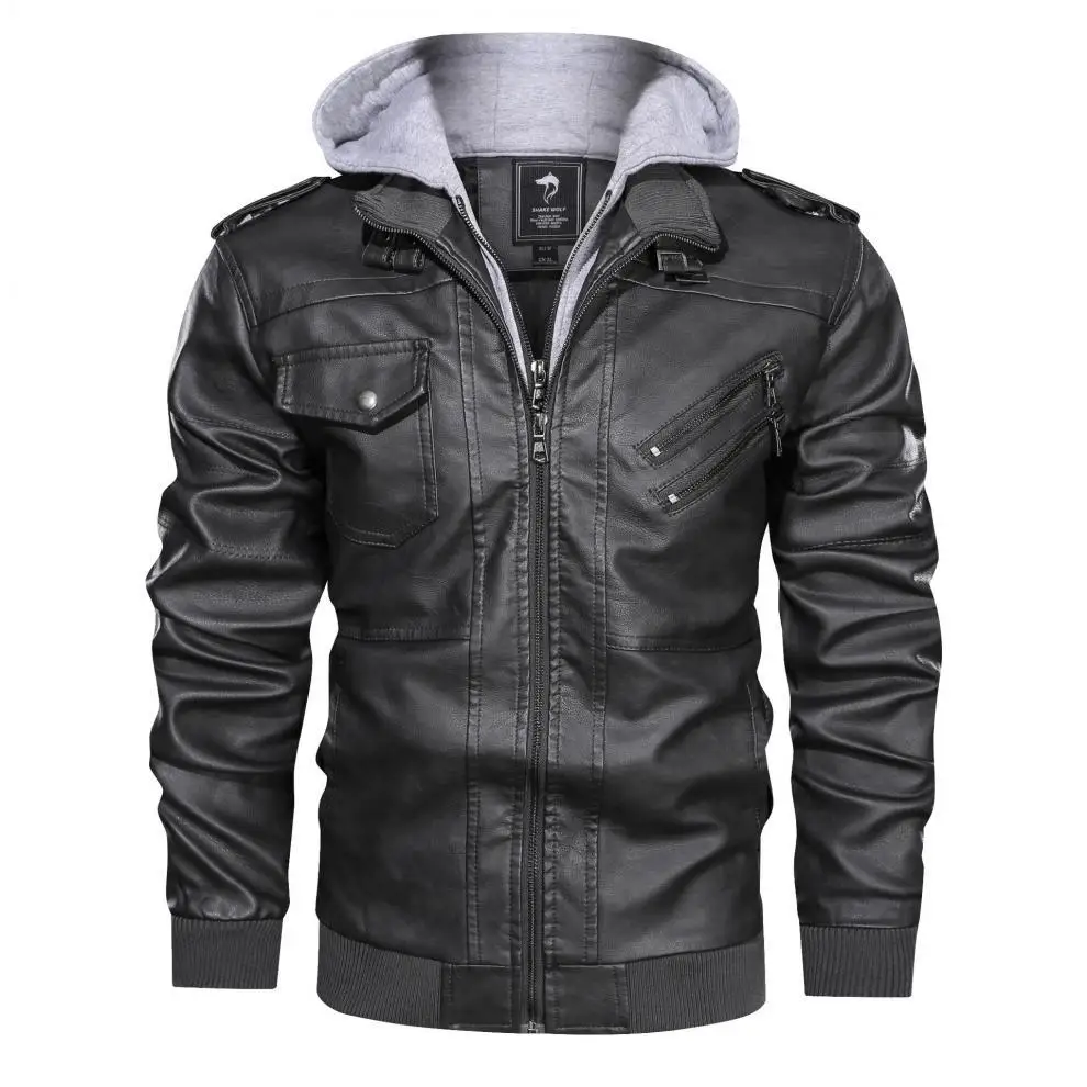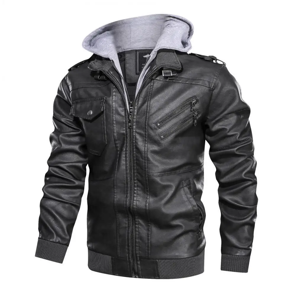 Men Jackets Fake Two Leather Jacket Double Zipper Removable Hooded Biker Leather Coat Male Cardigan Overcoat