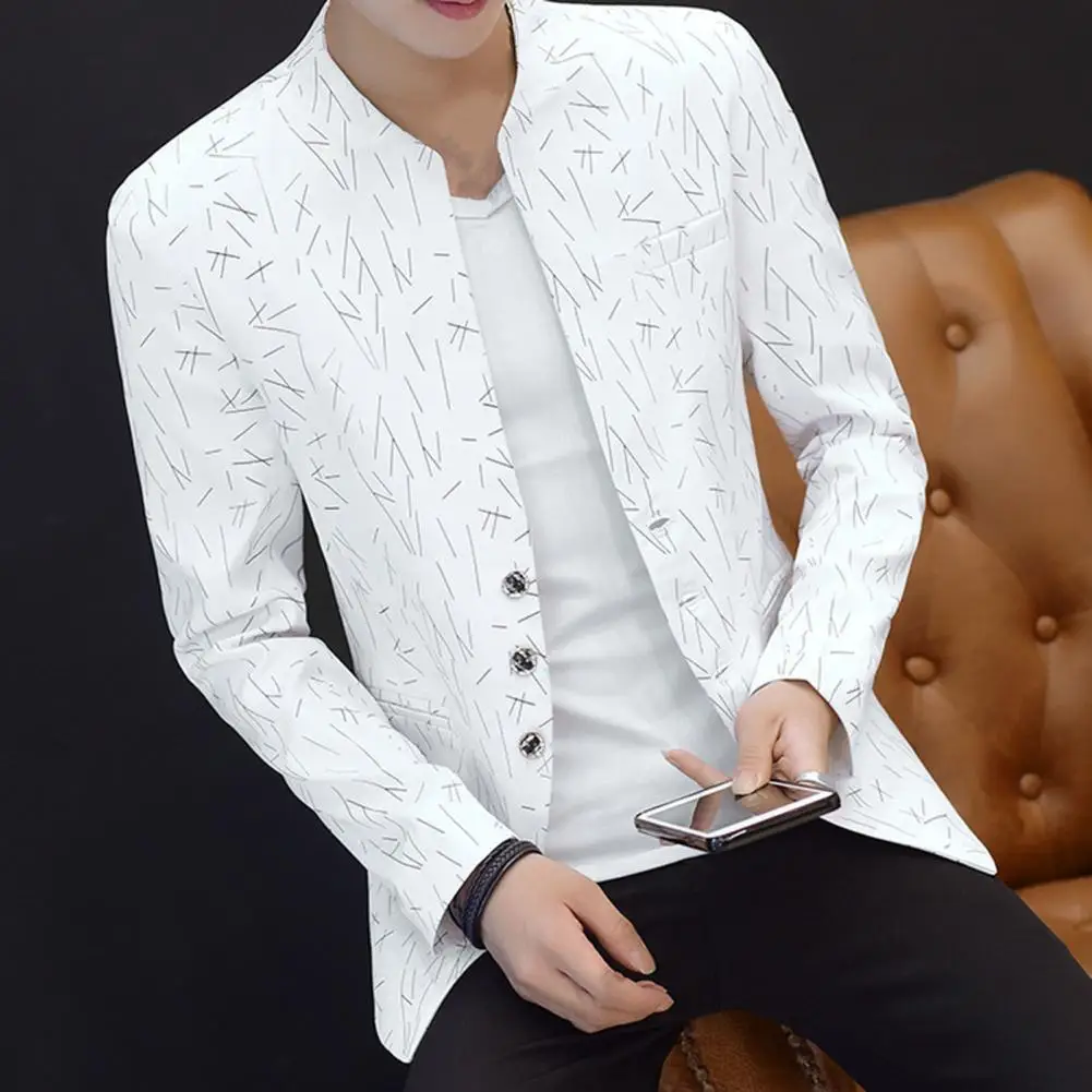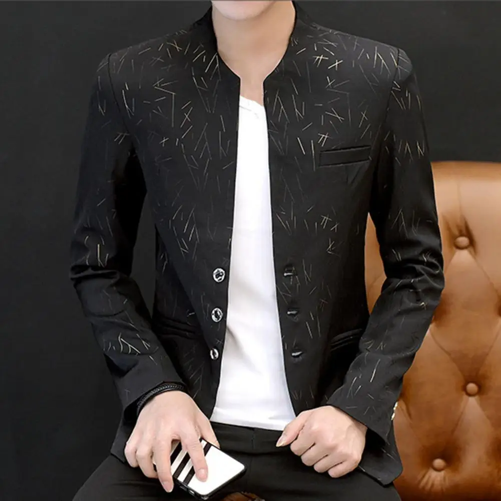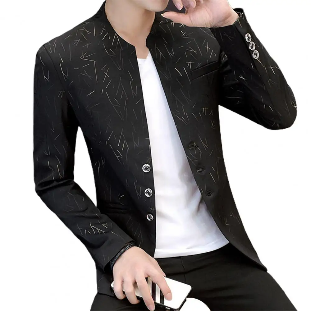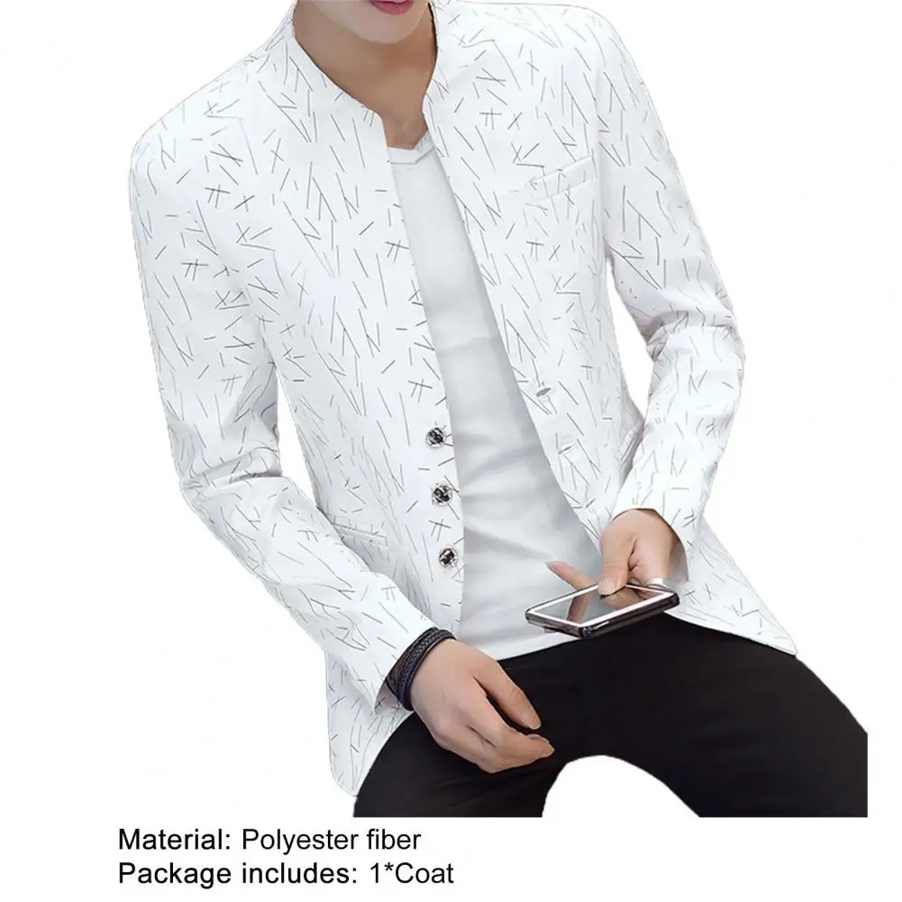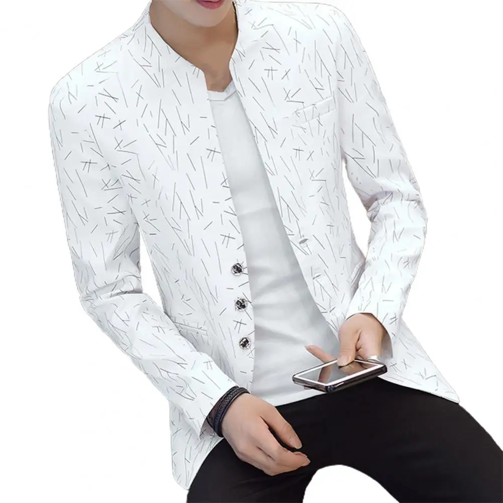 Men Blazer Vintage Print Korean Style Spring Autumn Stand Collar Fake Pockets Buttons Blazer for Business