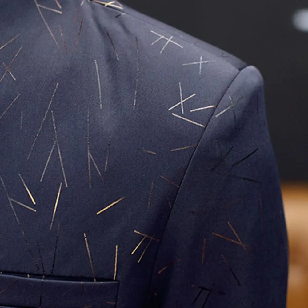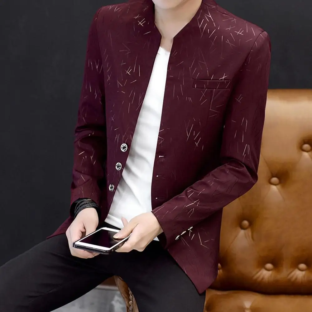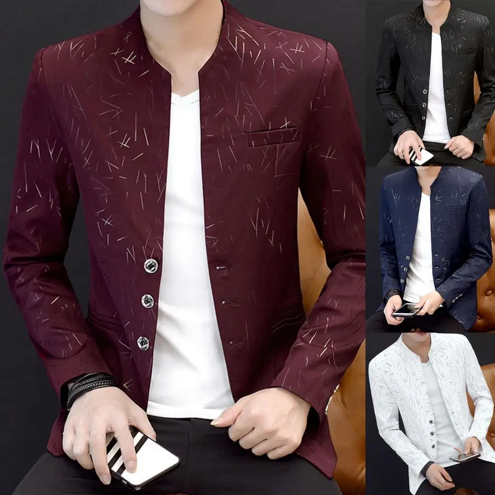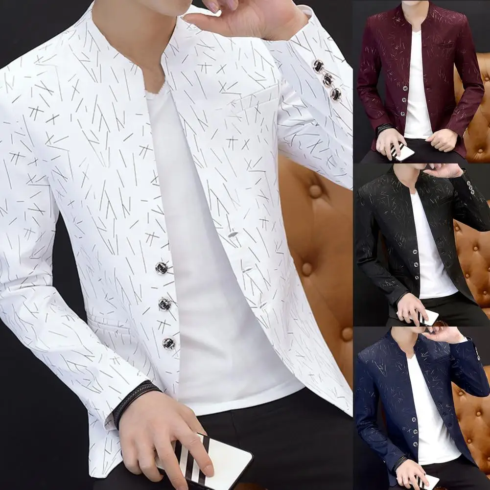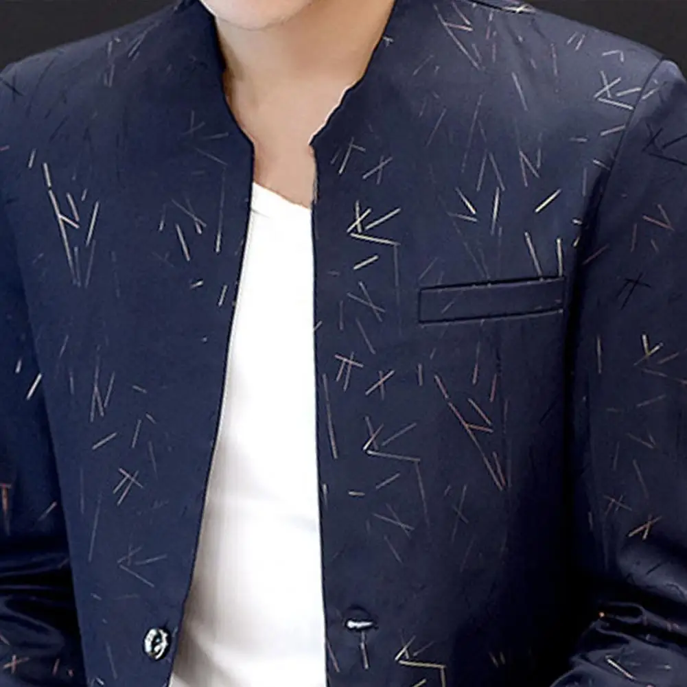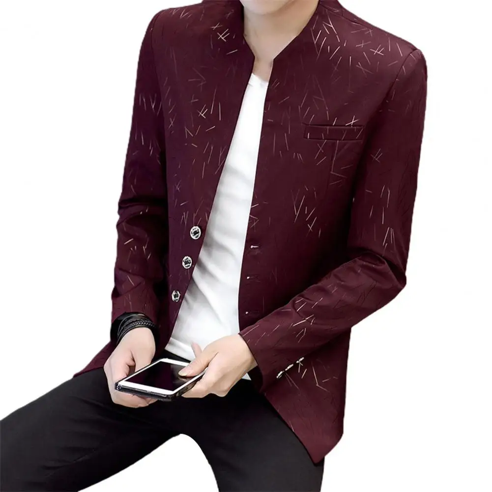 Men Blazer Vintage Print Korean Style Spring Autumn Stand Collar Fake Pockets Buttons Blazer for Business