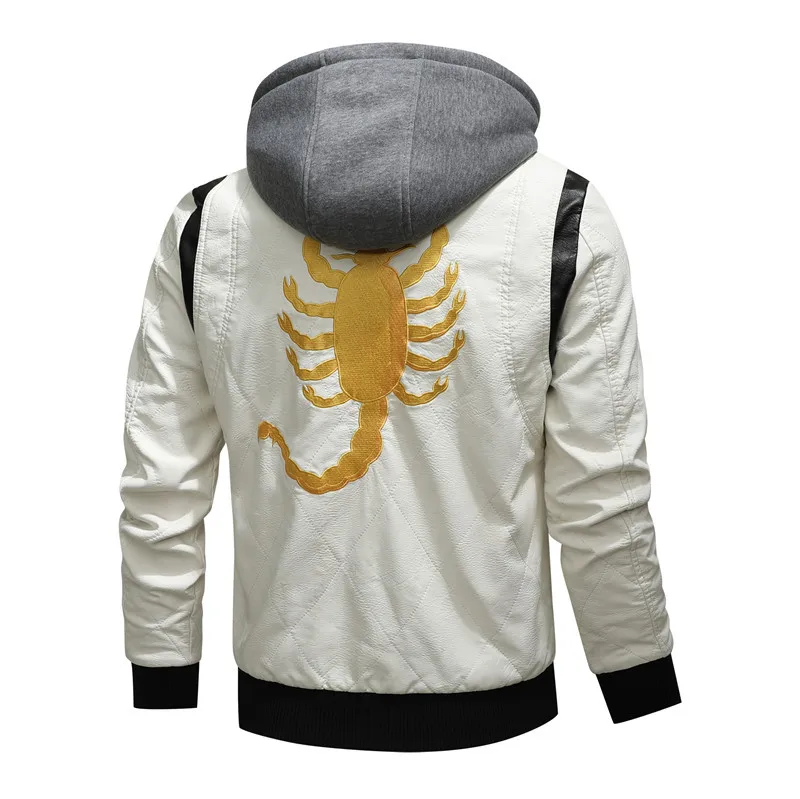 Men Winter Driving Leather Jacket Men Scorpion Embroidered Hooded Jacket PU Leather Motorcycle Jacket