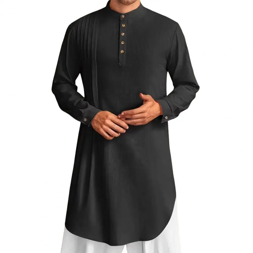 Men's Cotton Linen Kaftan Long Sleeve O-Neck Robe Solid Color Button-up Collar Thobe Breathable Arabic Clothing for Prayers Casual Wear