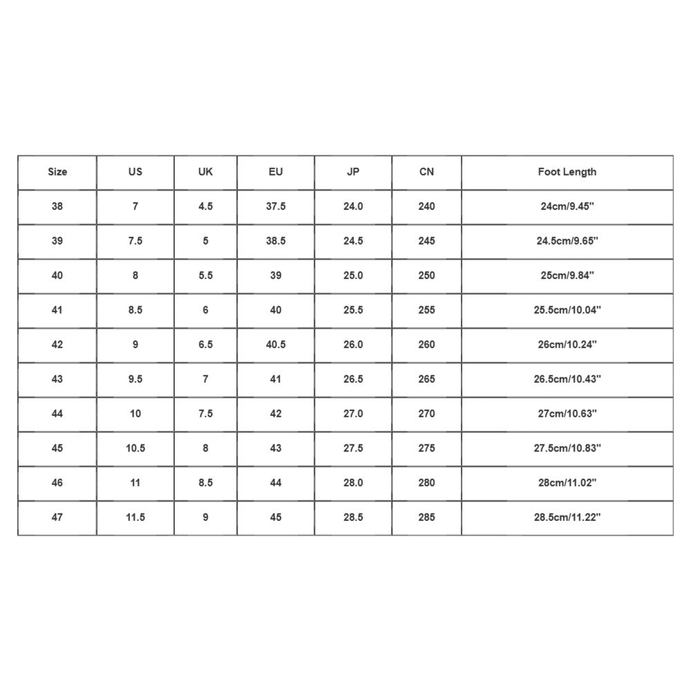 | Size:45 | US:10.5 | UK:8 | EU:43 | JP:27.5 | CN:275 | Foot Length:27.5cm/10.83'' |