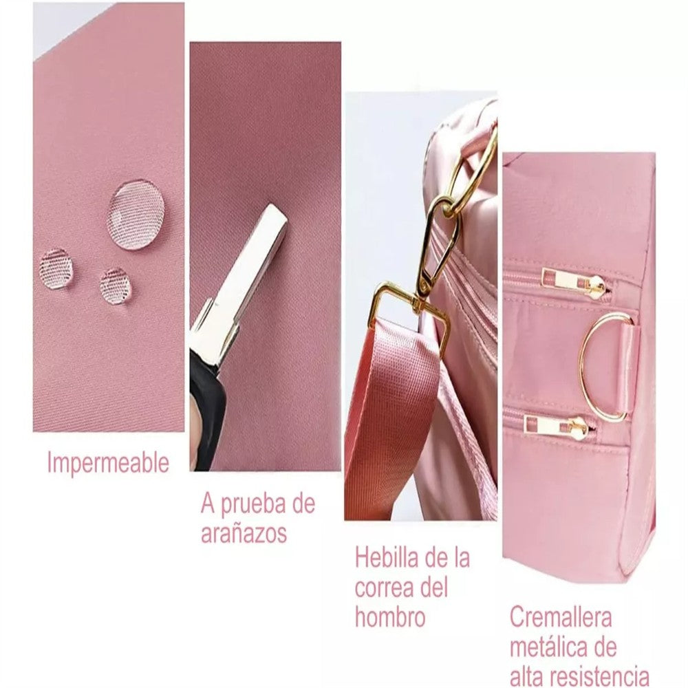 1 main zip pocket, 1 wipe divider pocket, 1 small front pocket, 1 separate shoe pocket, 1 side zip pocket.