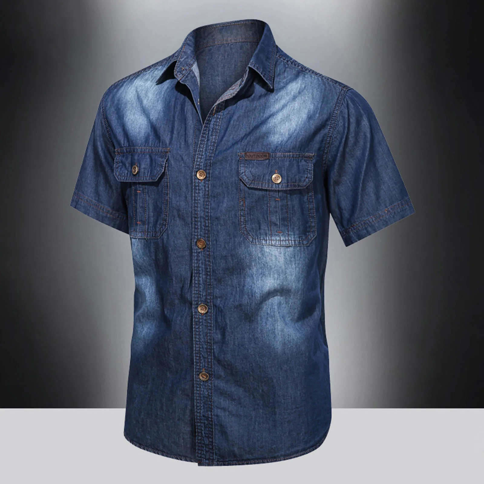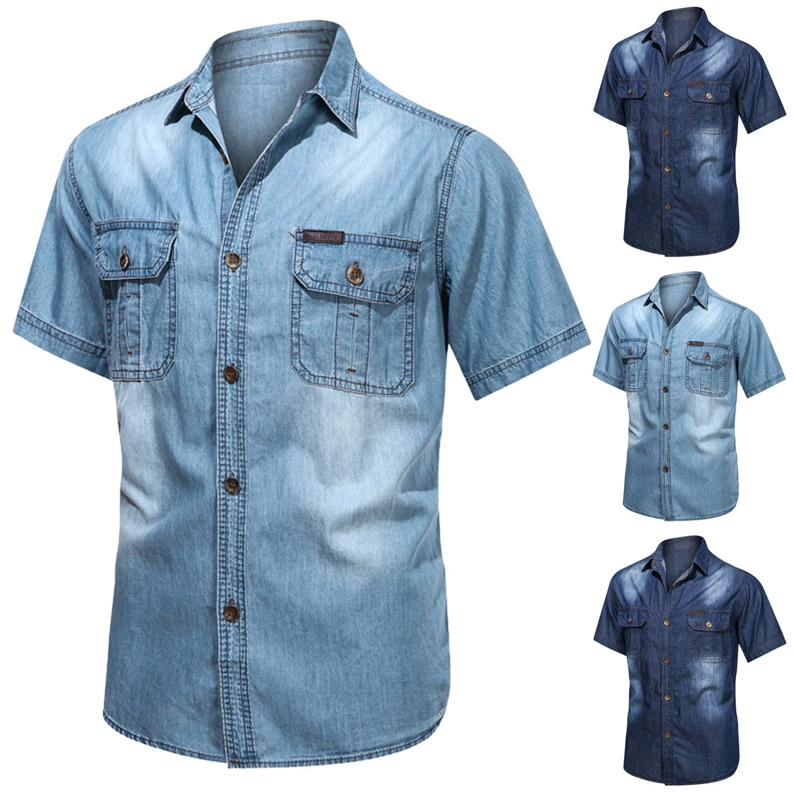 Men's Vintage Denim Cargo Shirts Summer Solid Short Sleeve Lapel Neck Multi Pockets Button Down Thin Casual Temperament Tops