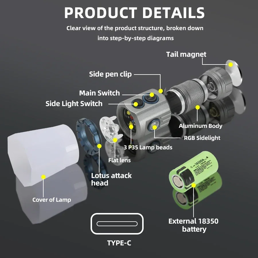 Mini EDC Flashlight 2000LM 18350 Battery USB Rechargeable LED Flashlight with Tail Magnet RGB Side Lamp Camping Emergency Lamp